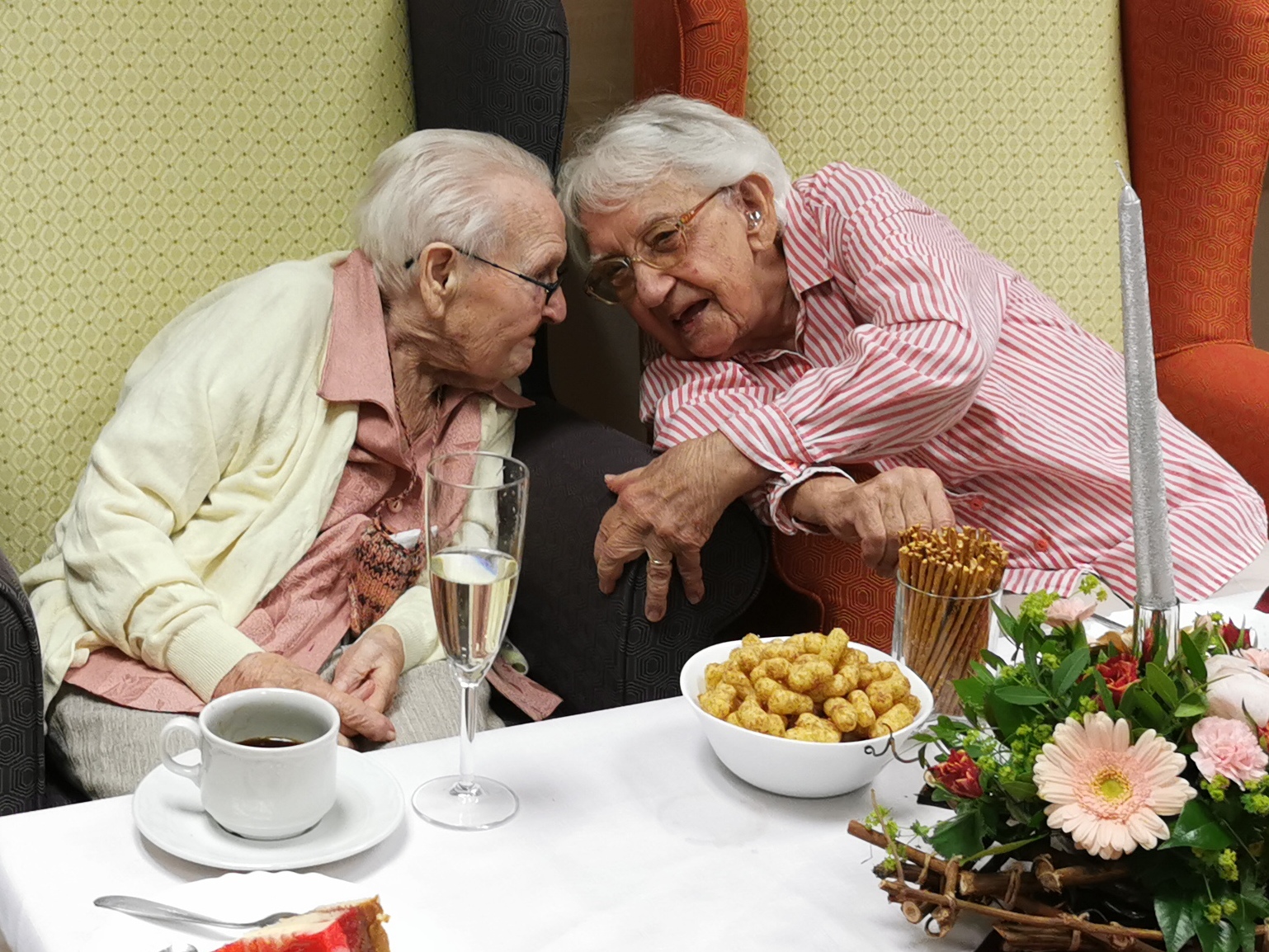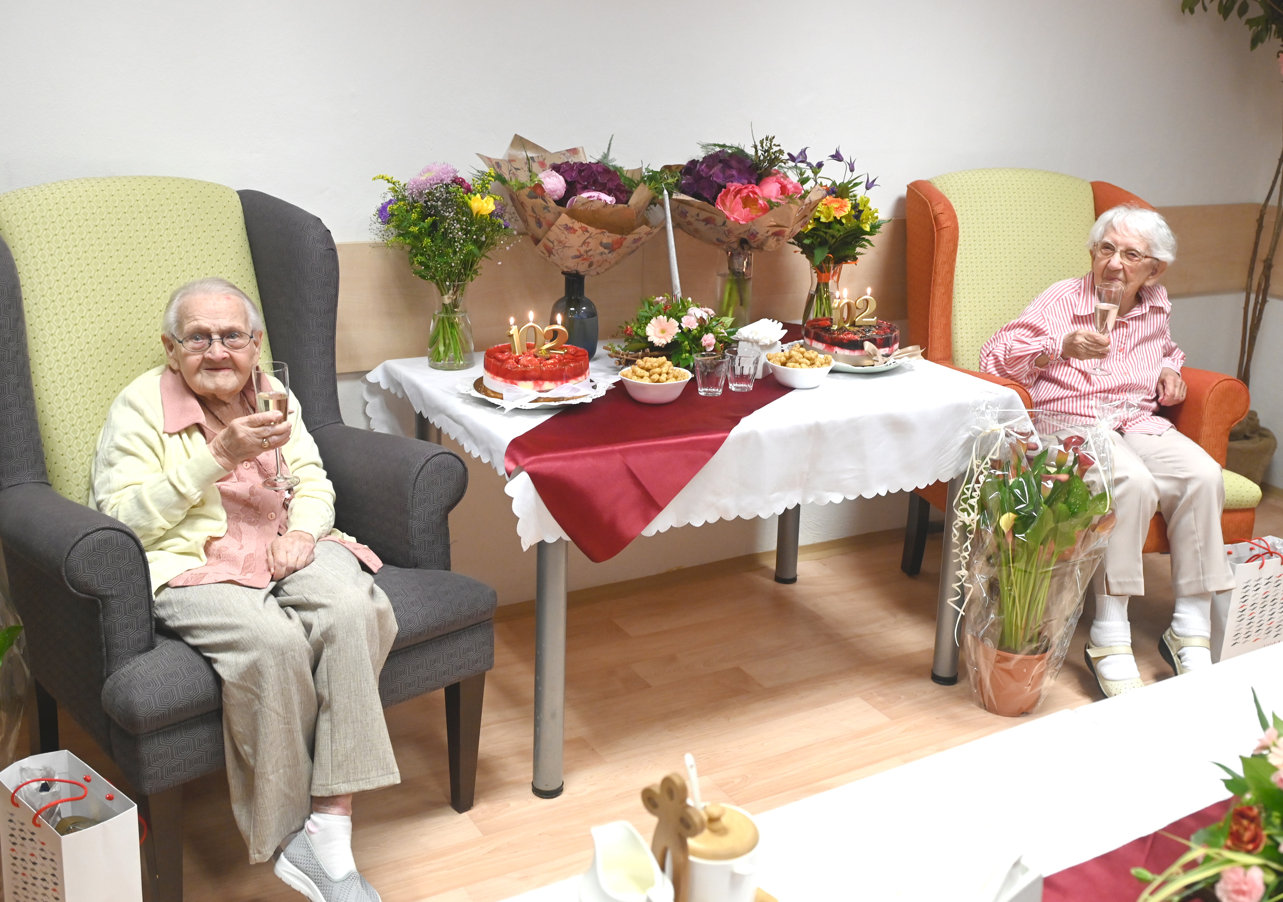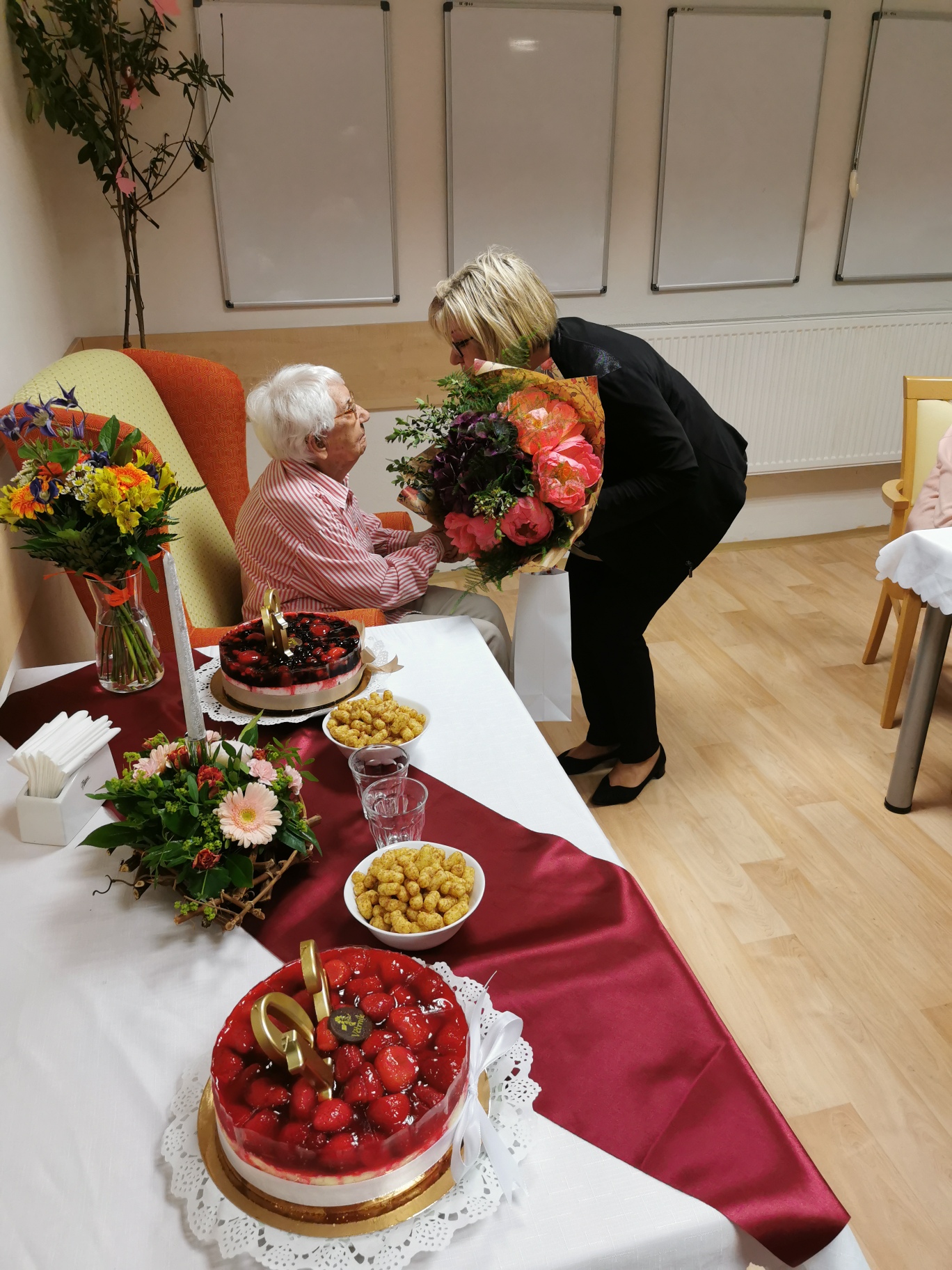 Ve čtvrtek 8.6. v našem Domově proběhla oslava narozenin našich klientek a to paní Květoslavy Meinerové a Jarmily Chytré, které slaví svoje narozeniny spolu už druhým rokem. Tentokrát oslavily 102. narozeniny. Jsou stále vitální a umí si užívat krás života. Zúčastnila se blízká rodina, zaměstnanci, ředitel Domova pan Mgr. Martin Petřík a zástupci města Brna paní Mgr. Alice Zafirelisová-vedoucí odboru, Bc. Jana Šťavíková - odbor soc. péče MMB, Mgr. Jarmila Gergelčíková - odbor soc. péče MMB.