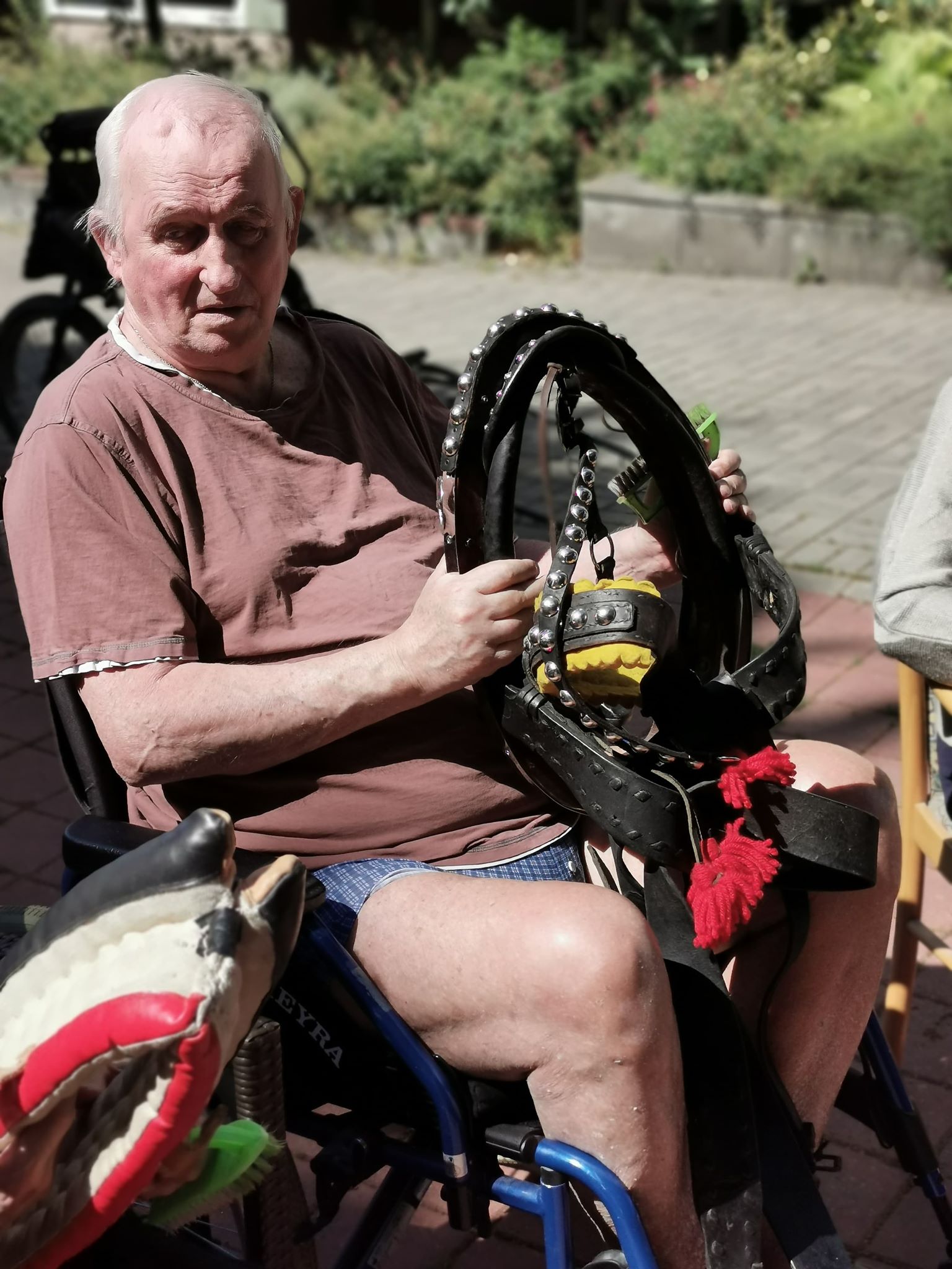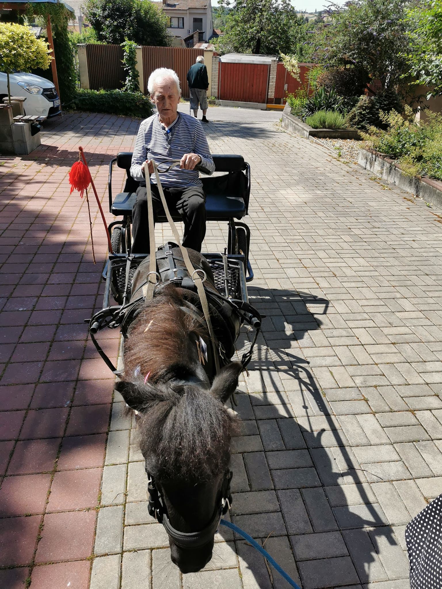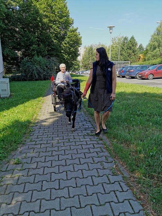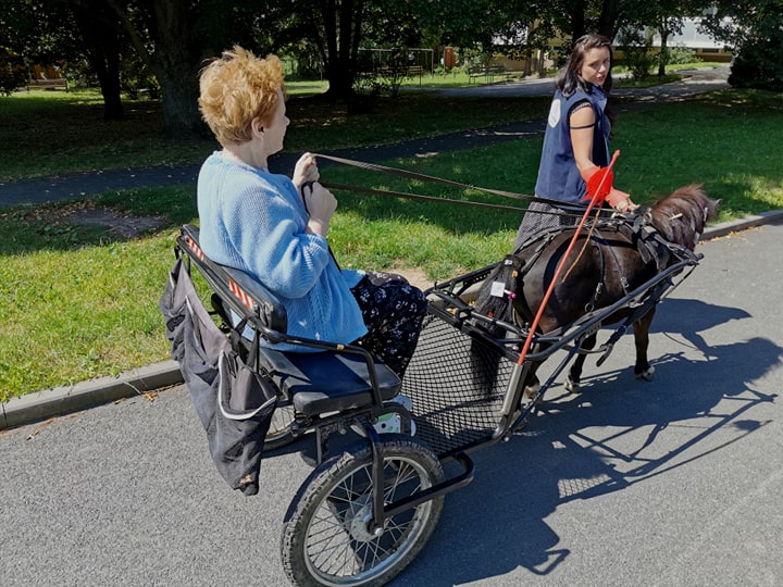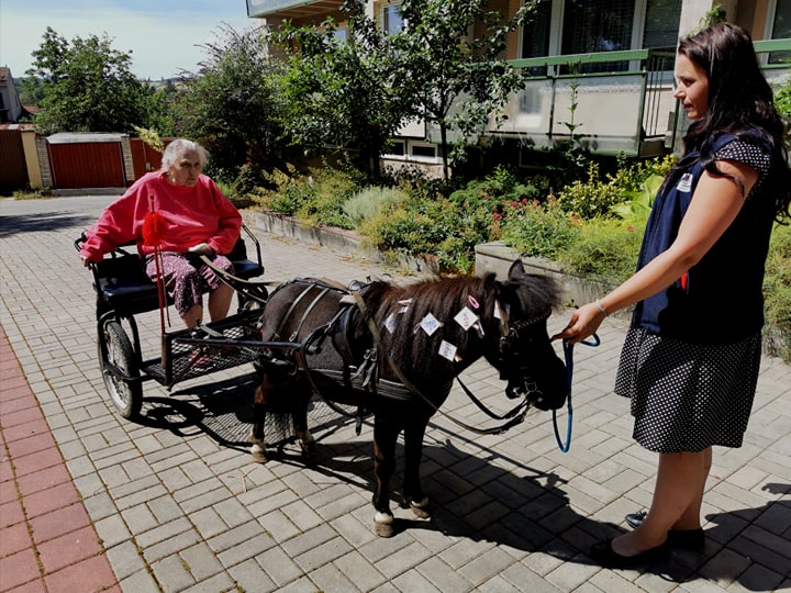 Emil se již stal zvířecím kamarádem a klienti se na setkání s ním vždy těší. Díky příznivému počasí se mohlo uskutečnit setkání v zahradě domova a klienti si tak vyzkoušeli, že i malý kůň má velkou sílu.