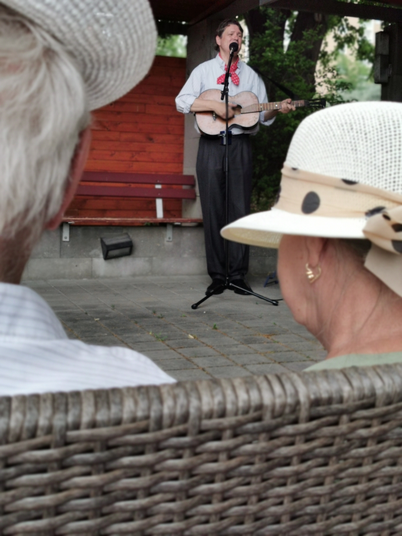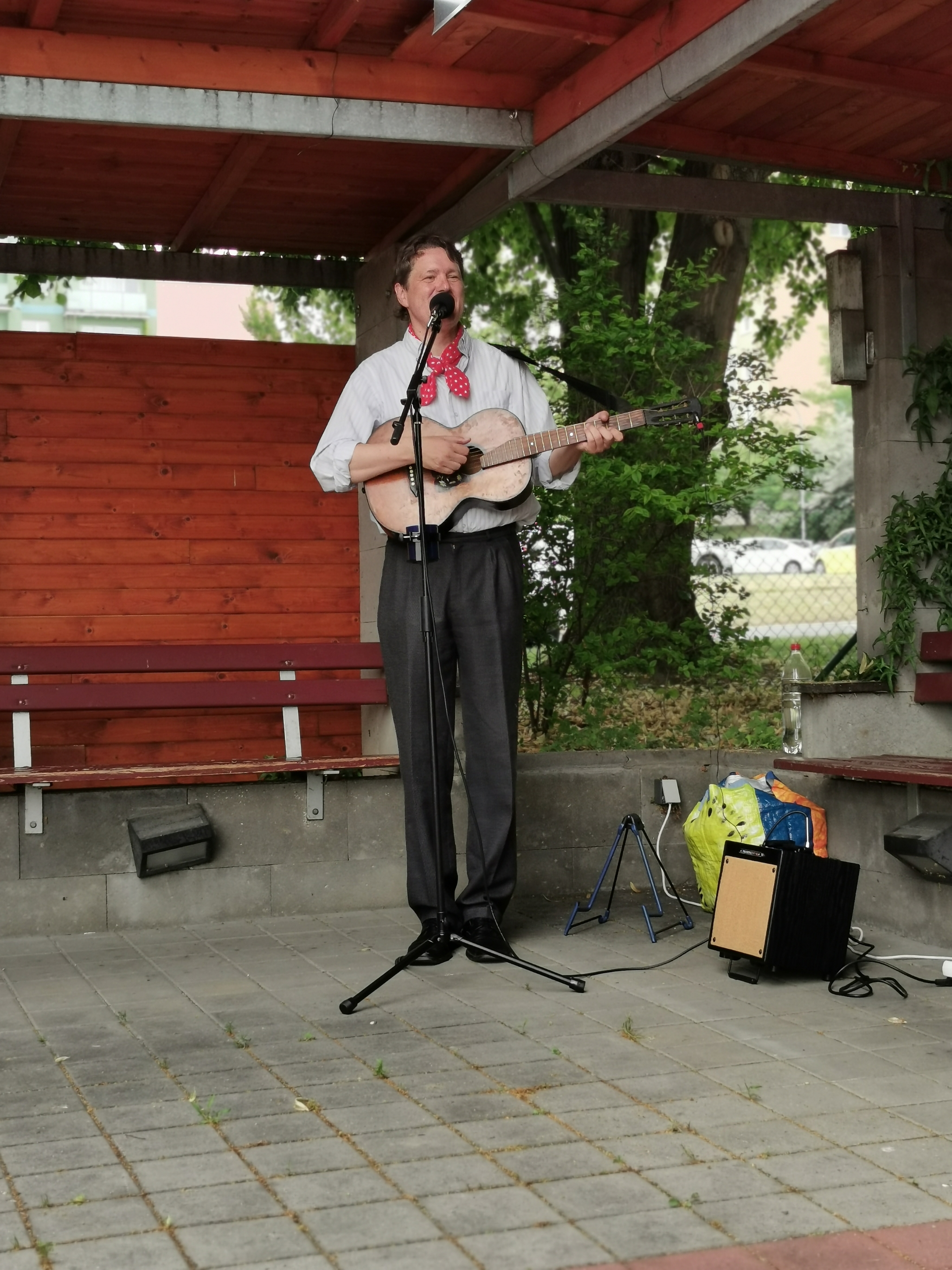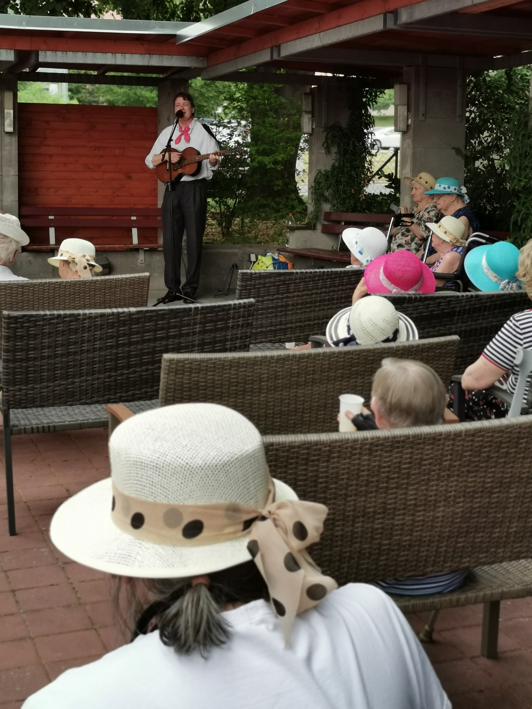 Vladimír Pecháček, dlouholetý bývalý člen legendární skupiny Patrola Šlapeto a orchestru Ondřeje Havelky, k nám do Domova přijel zazpívat v doprovodu kytary písně staropražské, lidové, populární hity Karla Hašlera i známé melodie z filmů pro pamětníky. Navzdory horkému počasí jsme si zazpívali spolu s ním.