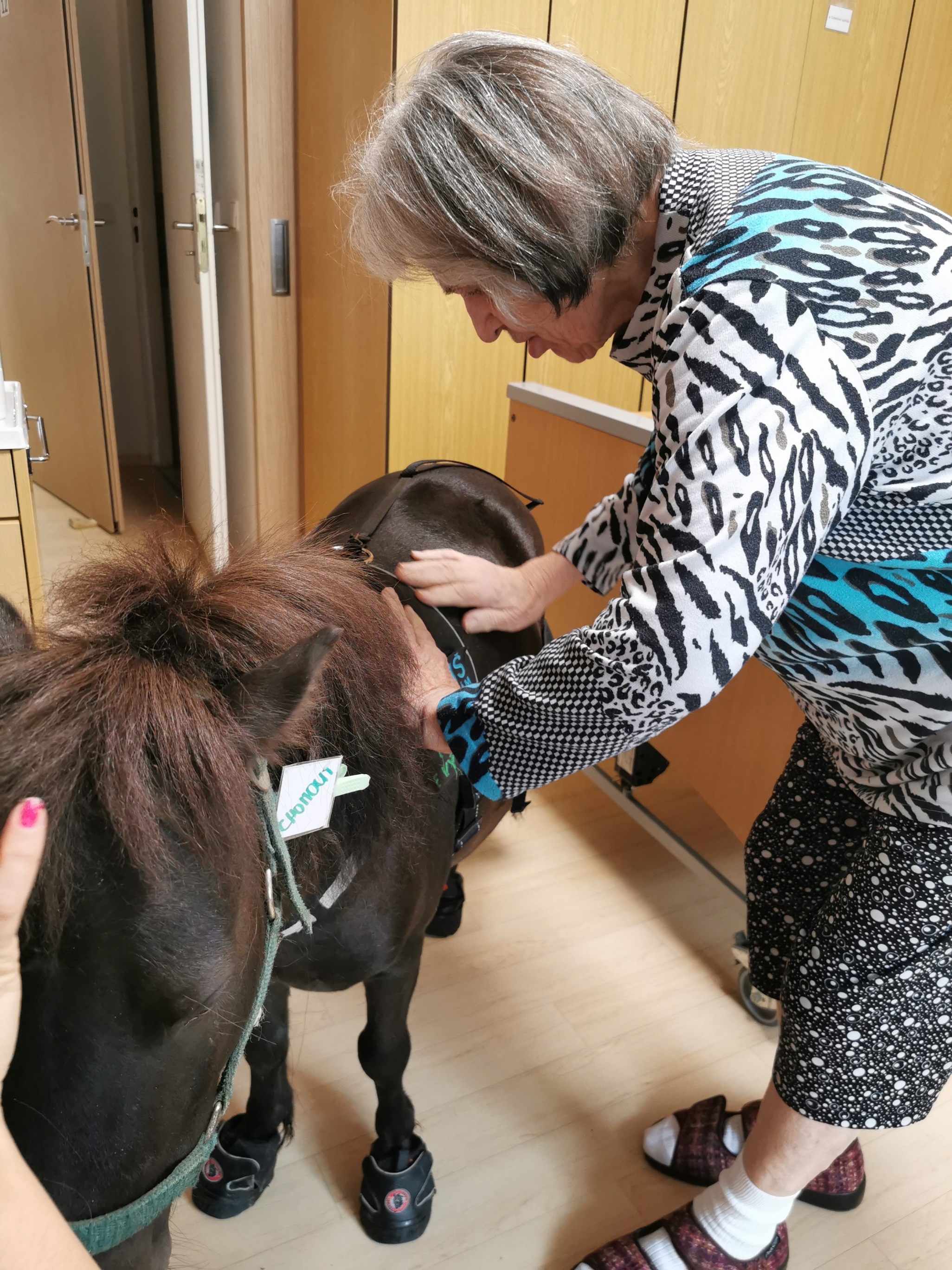 Dne 23.8.2022 navštívila paní Veronika z nadace Emil pomáhá 1.oddělení se svými zvířecími přátelil. Tentokrát přijela s poníkem Venoušem a malou kraličicí Jasmínou. Spousta klientů si při pohledu na Jasmínu vzpomnělo na dávné časy, kdy sami chovali králíky.