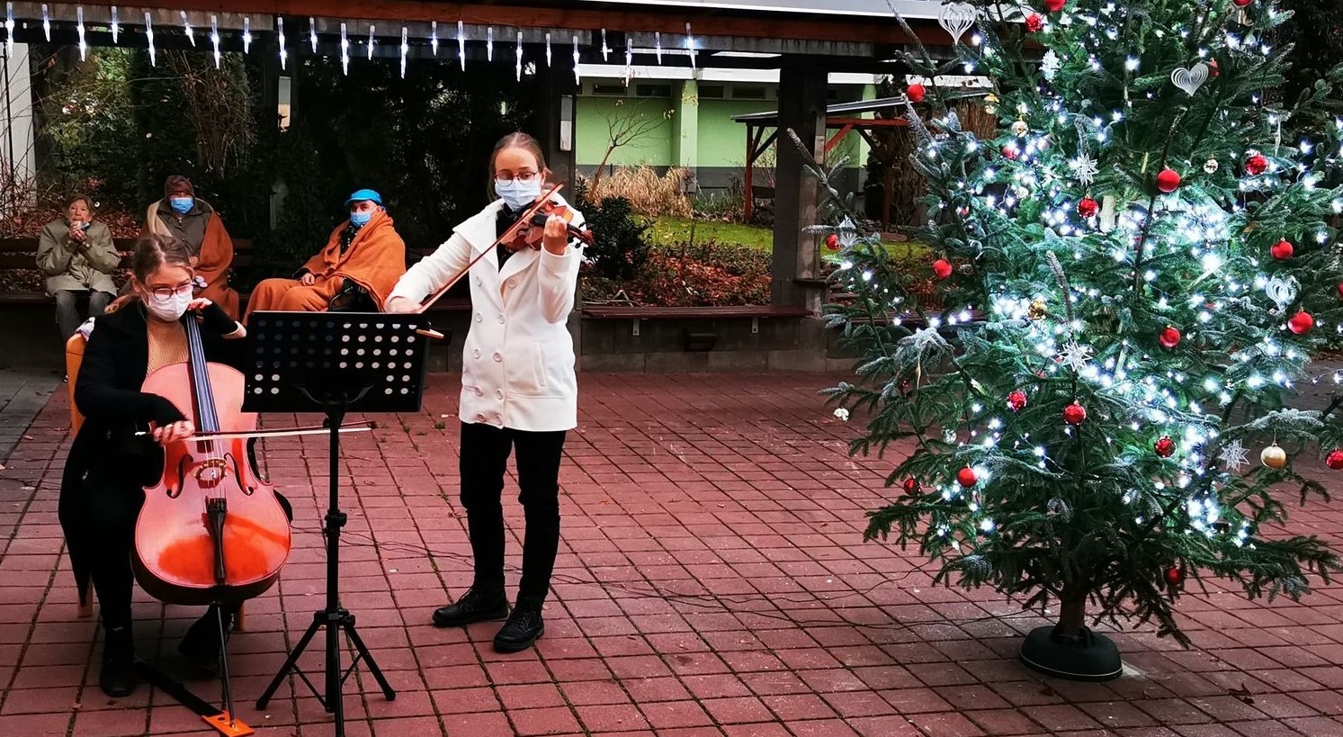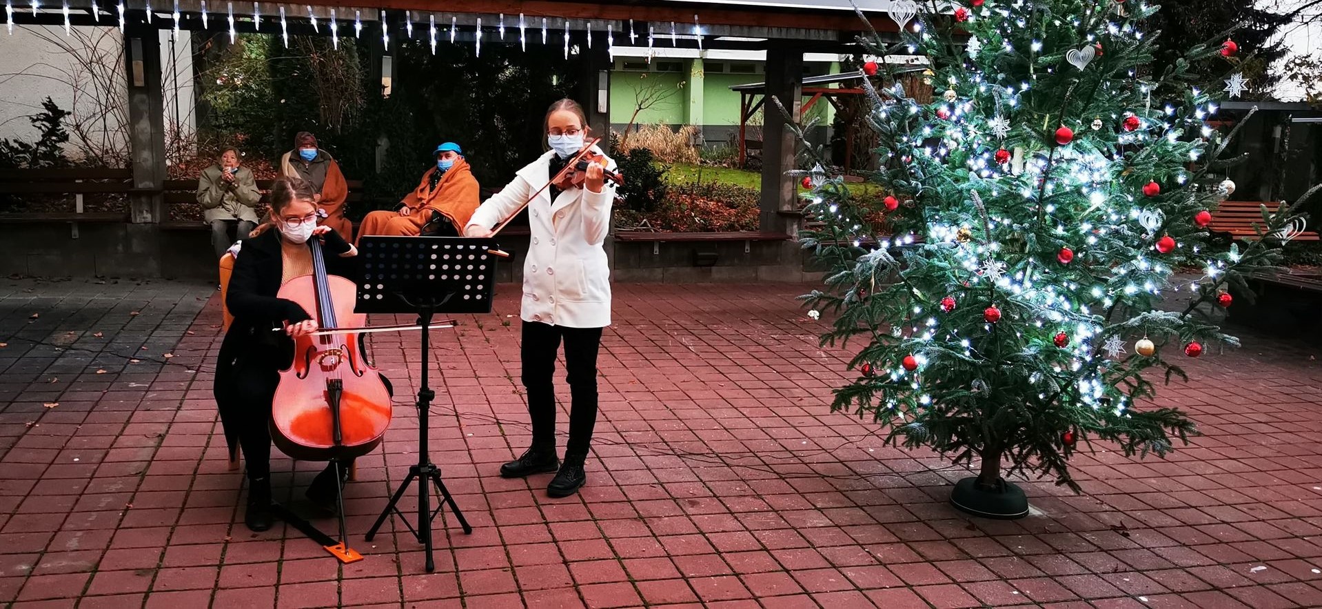 Krátký hudební program k rozsvícení stromku si pro naše seniory připravily studentky z brněnské konzervatoře Leoše Janáčka - Martina Lusková (housle) a Štěpánka Plocková (čelo), které zahrály známé vánoční melodie. Pro úplnost atmosféry jsme měli připraveno malé pohoštění v podobě svařeného vína a cukroví.