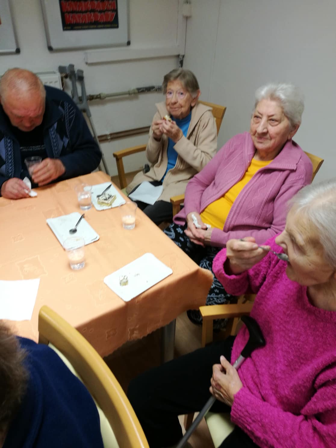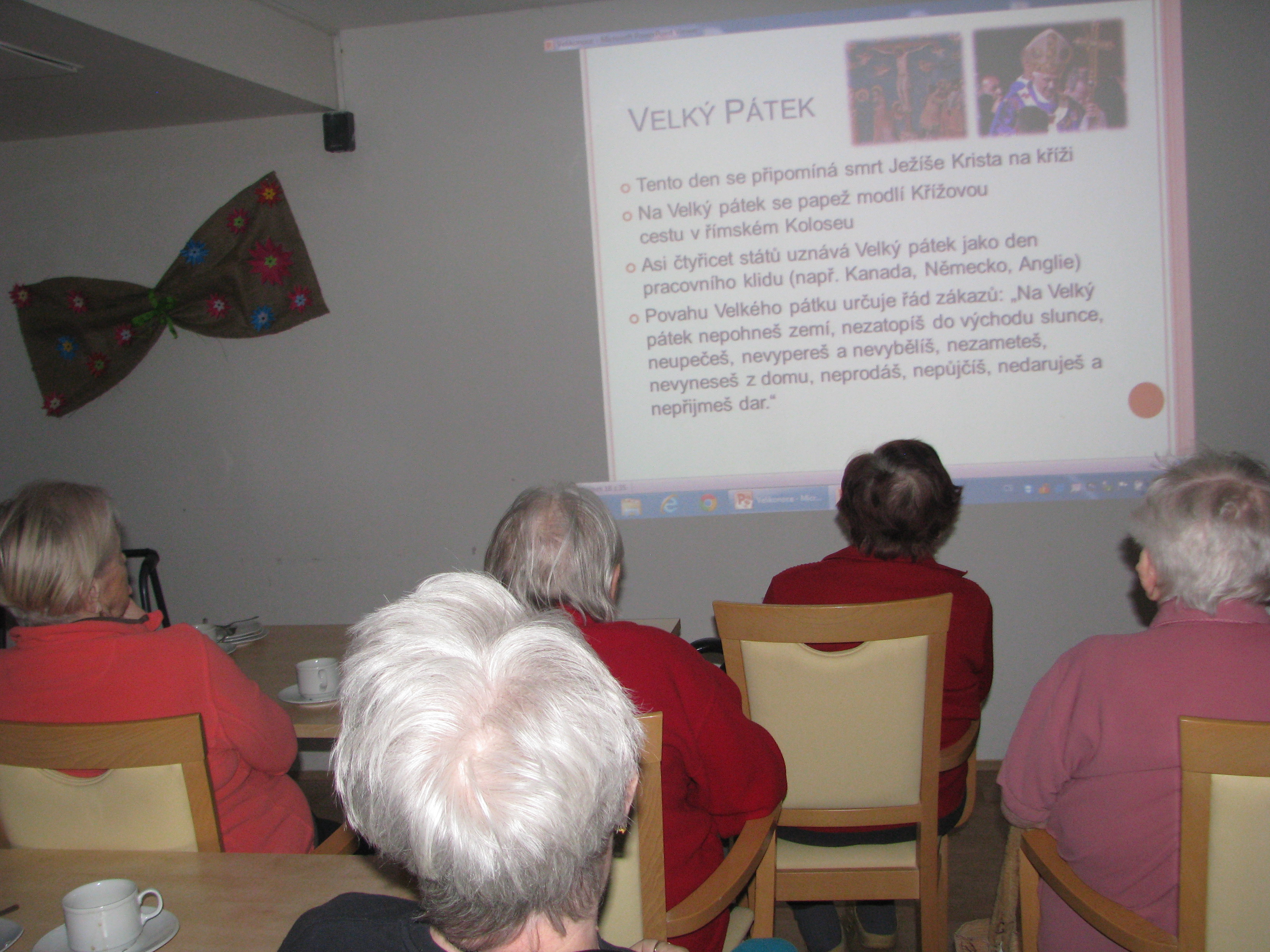 Na Velký pátek dne 19.4.2019 proběhlo posezení s klienty. Promítalo se tématické video, povídalo u čaje a klienti si pochutnali i na velikonočním beránku.