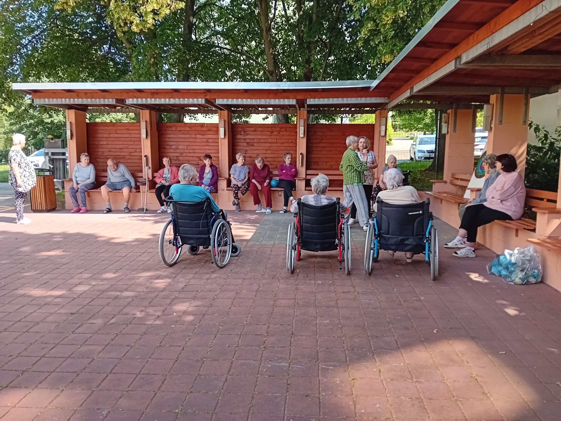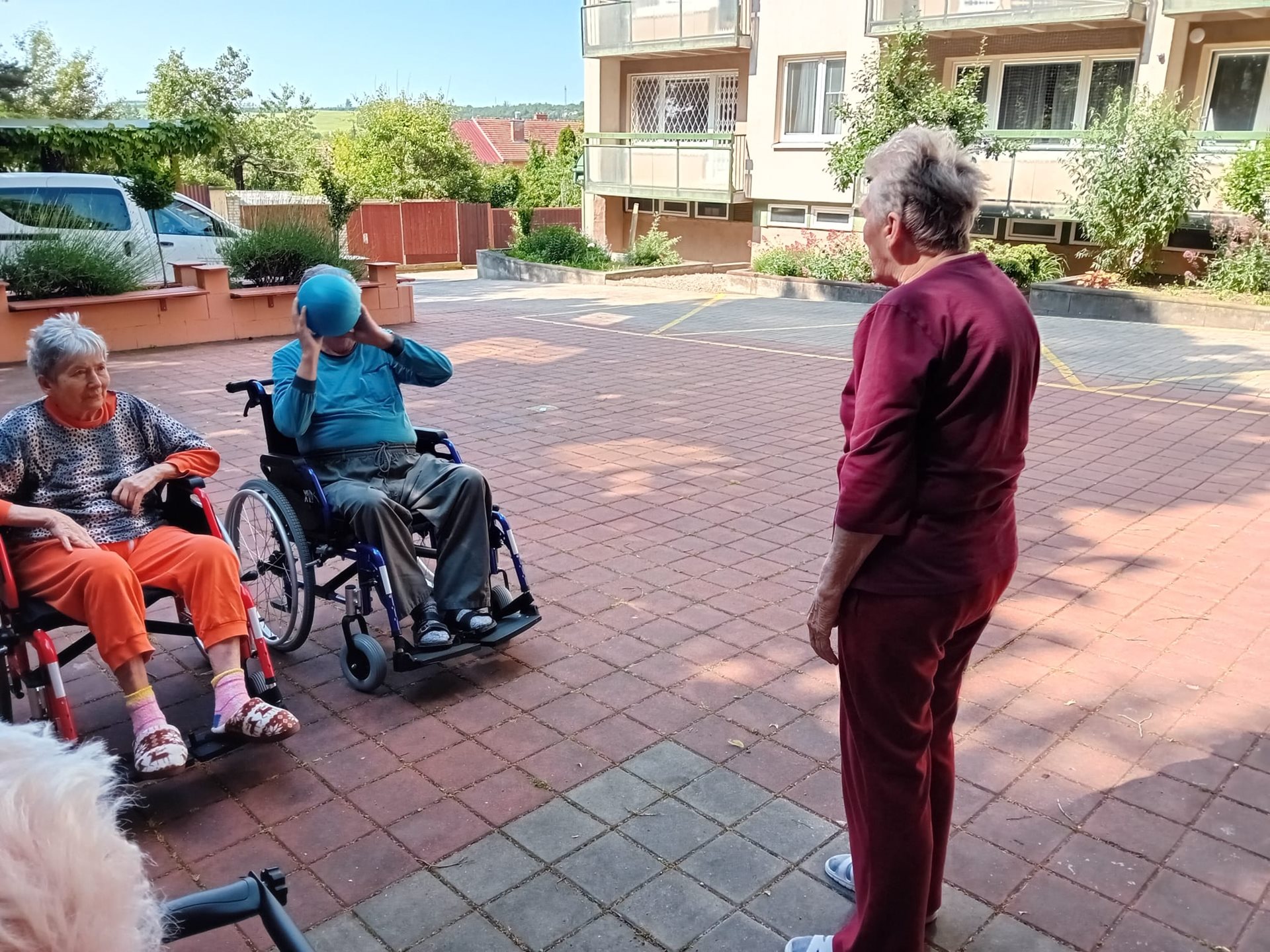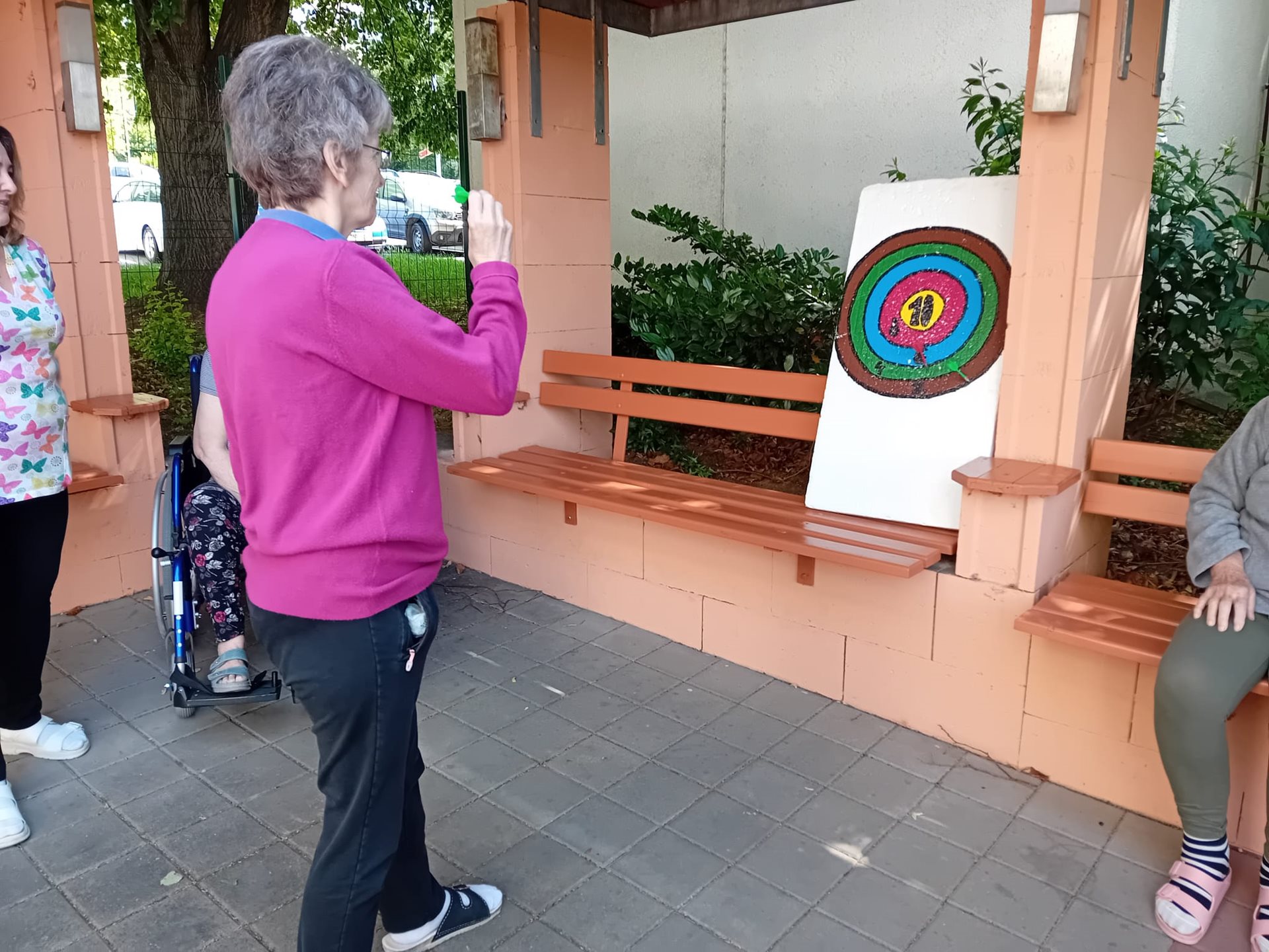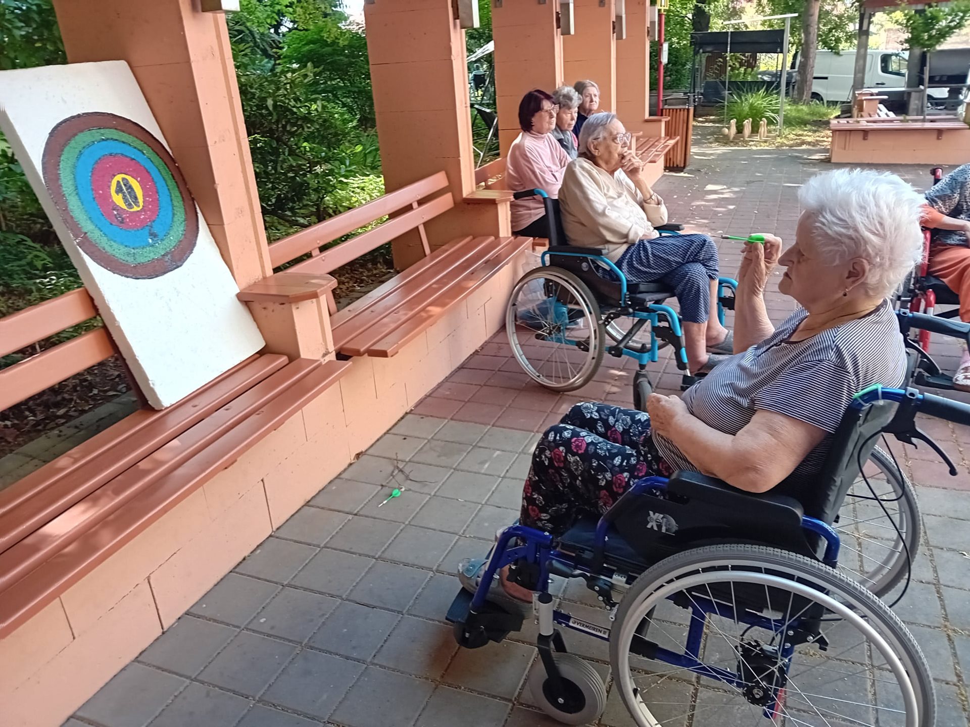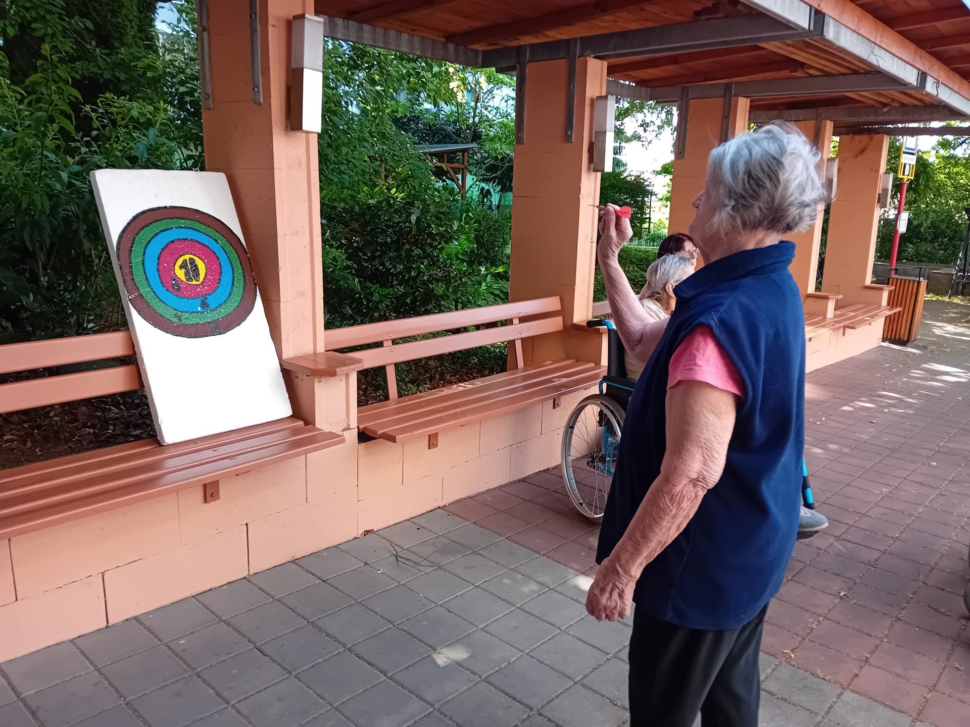 Dnes nás opět krásné počasí vylákalo na zahradu DS, kde klienti hráli oblíbené šipky a kuželky.