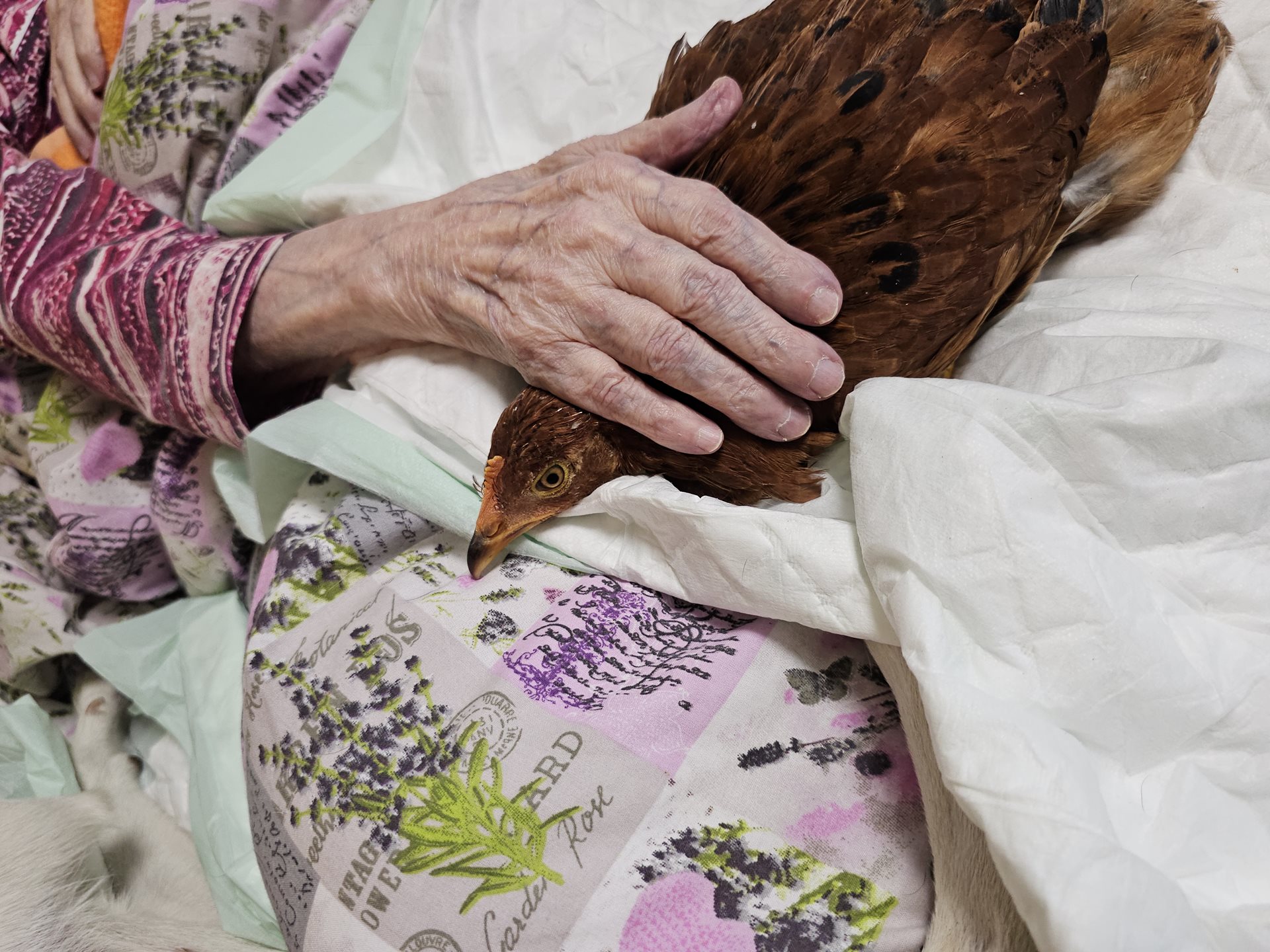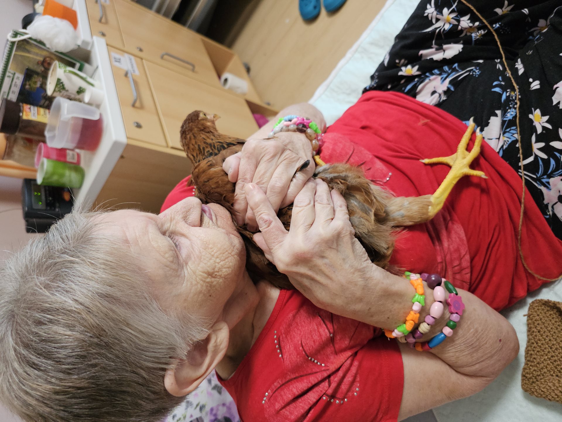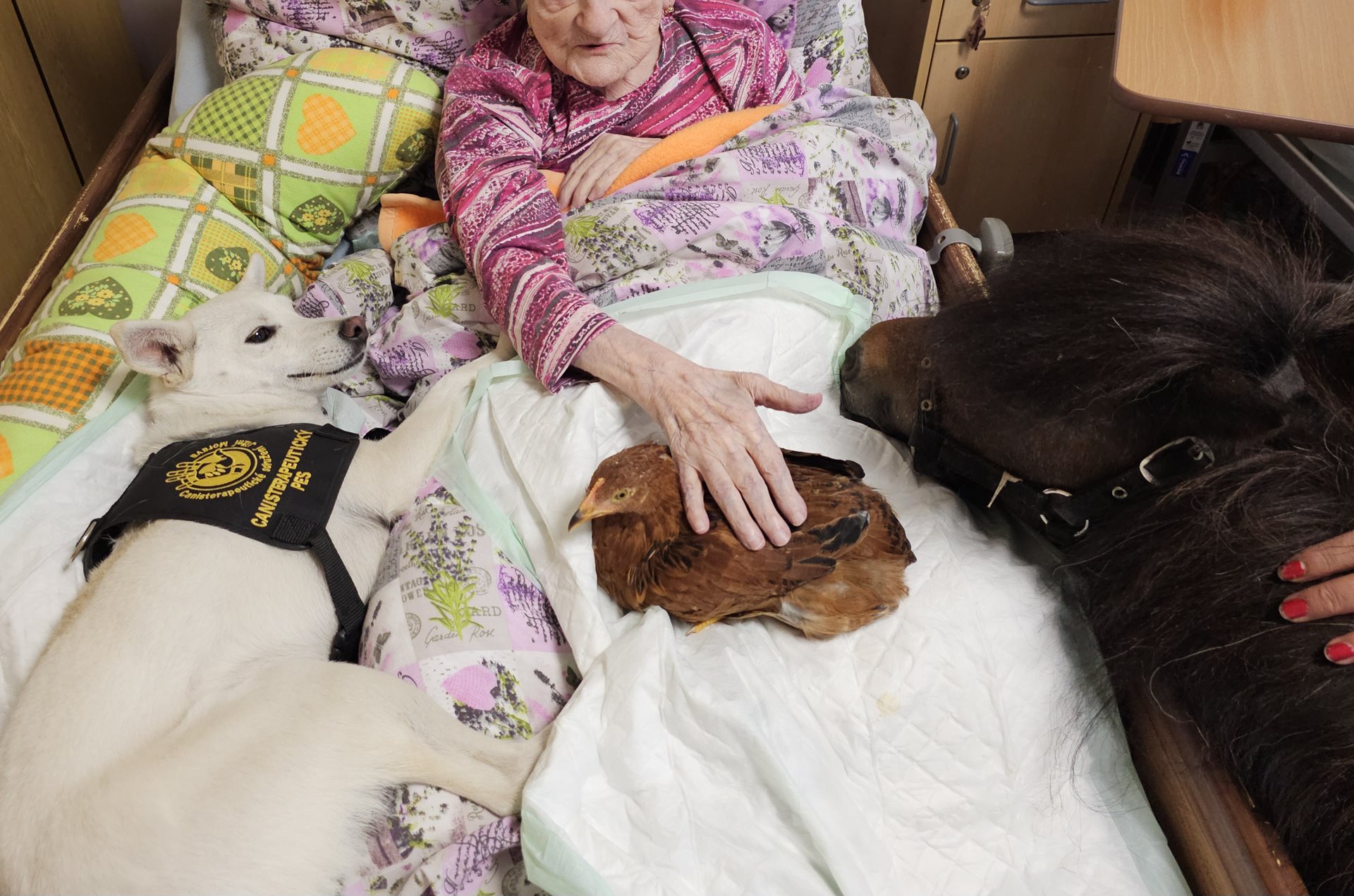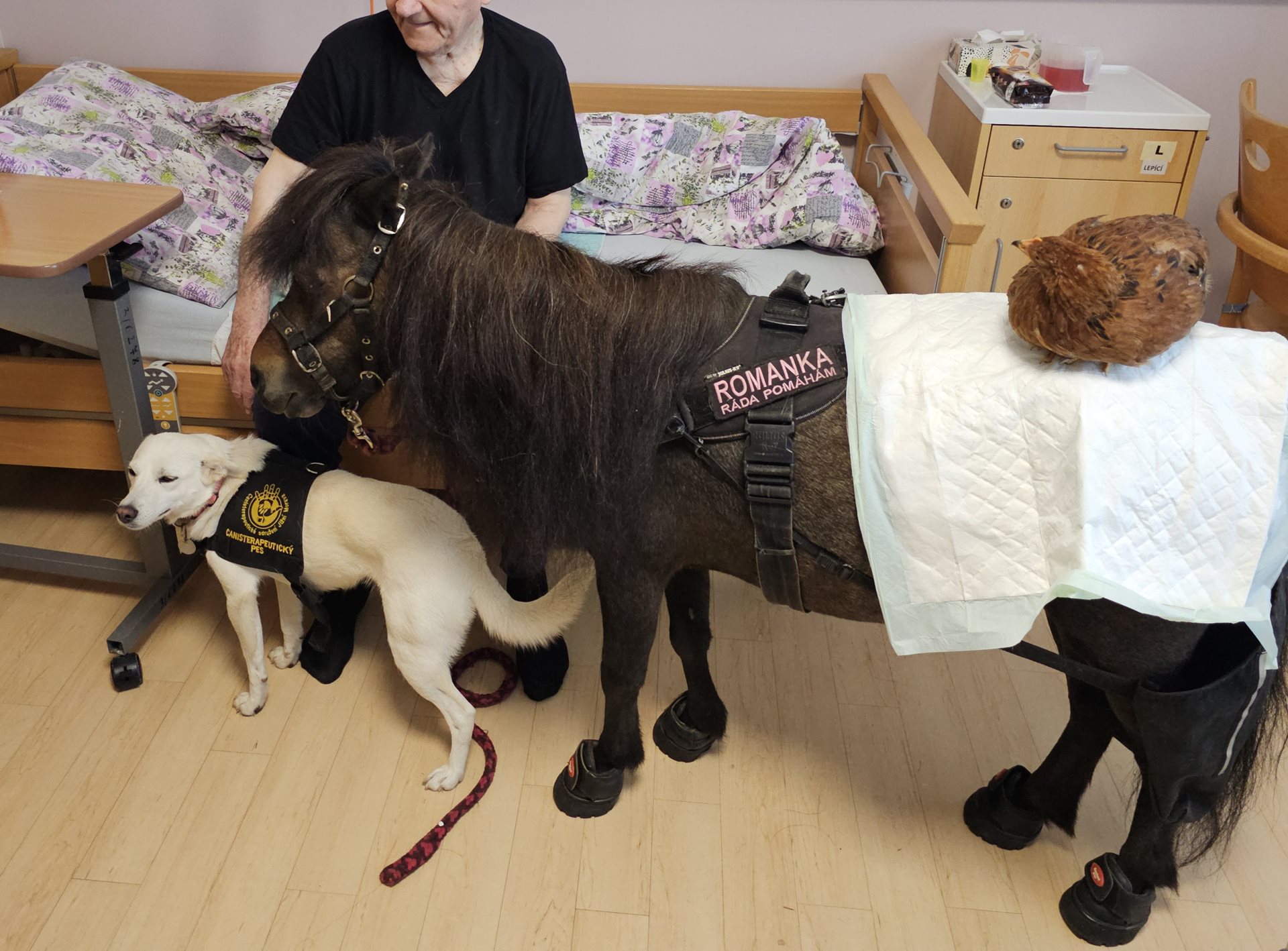 Dnes nám paní Veronika z nadace Emil pomáhá přivedla hned 3 zvířecí kamarády. Poníka Romanu, fenku Dášu a slepici Marunu. Navštívila s nimi klienty u lůžek na 2 oddělení. Bylo hodně veselo a hravo. Děkujeme