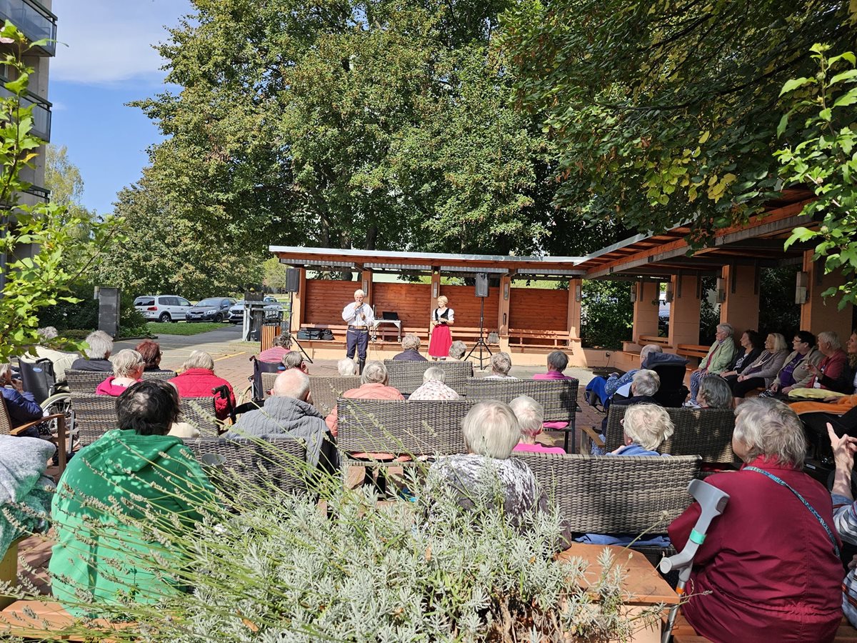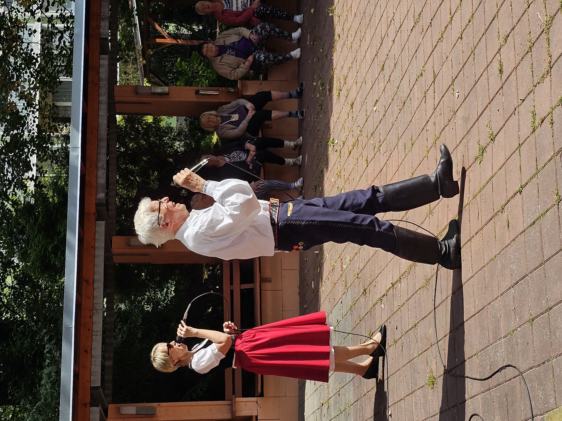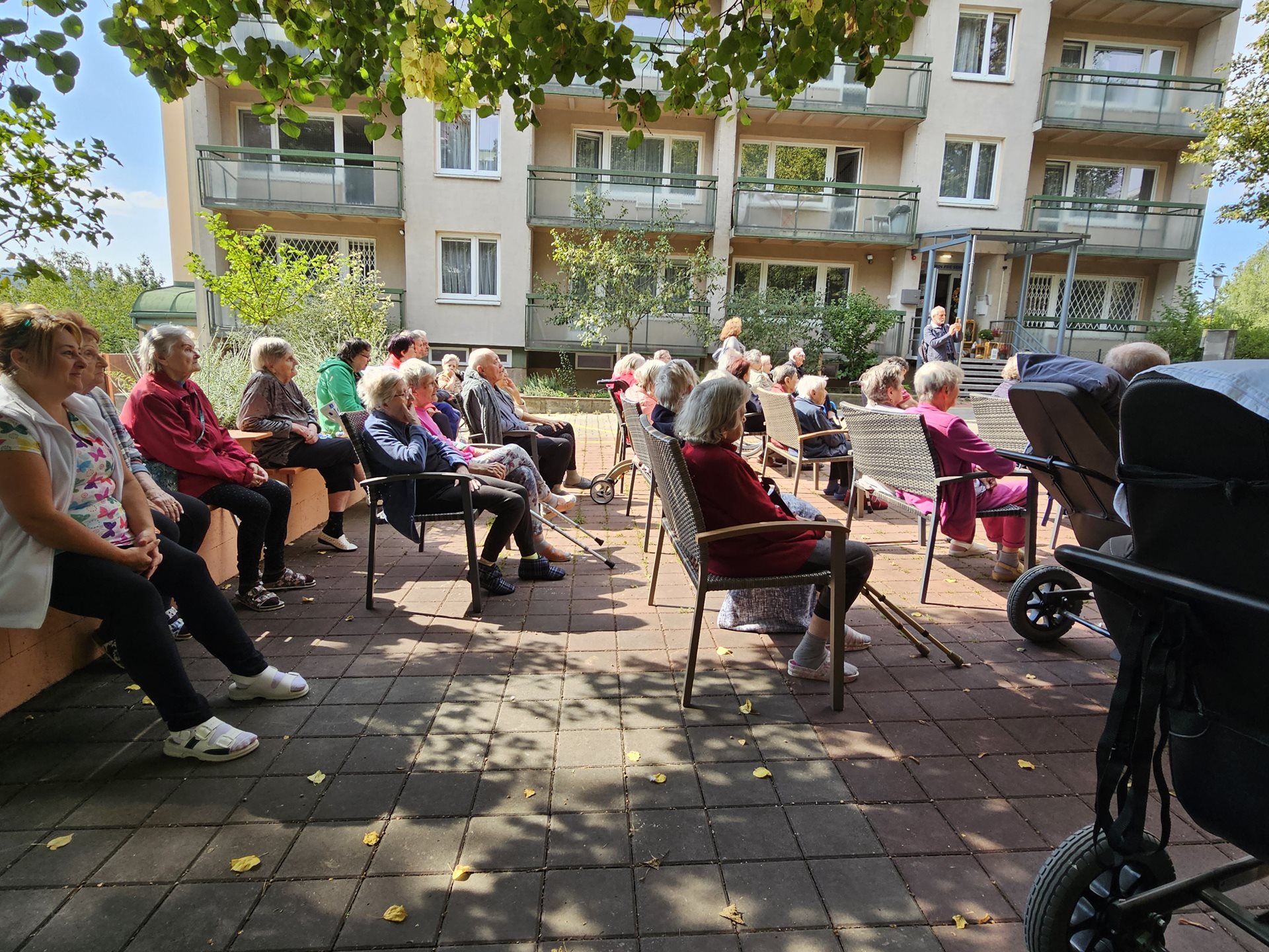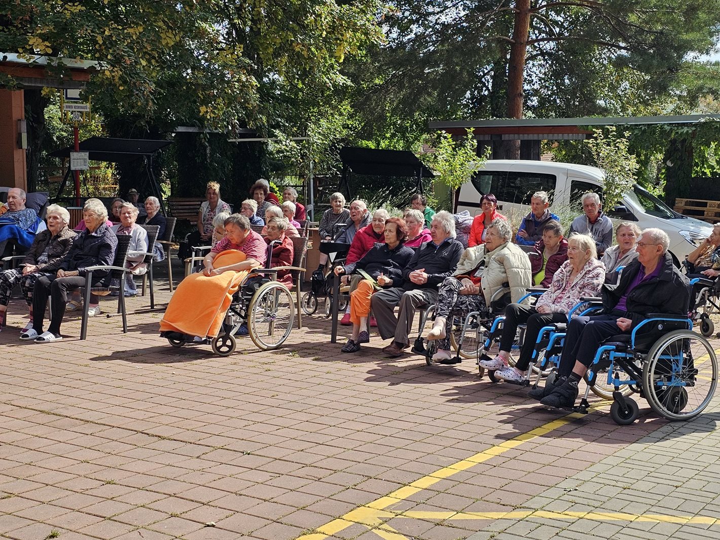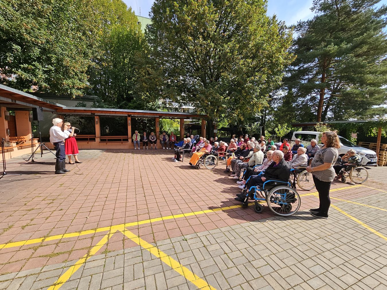 V pátek 20. září nás potěšil svojí návštěvou pan Jiří Helán se svojí pěveckou kolegyní Hankou Cvrkalovou. Prostřednictvím jejich písní jsme se rozloučili s létem a přivítali podzimní čas. Pan Helán je stále člověk plný optimismu a dobré nálady, kterou našim klientům předal i tím, že si s některými zatancoval. Počasí k nám bylo přívětivé a tak jsme zažili krásné slunné odpoledne v jejich společnosti. Děkujeme a těšíme se na další příjemné setkání.