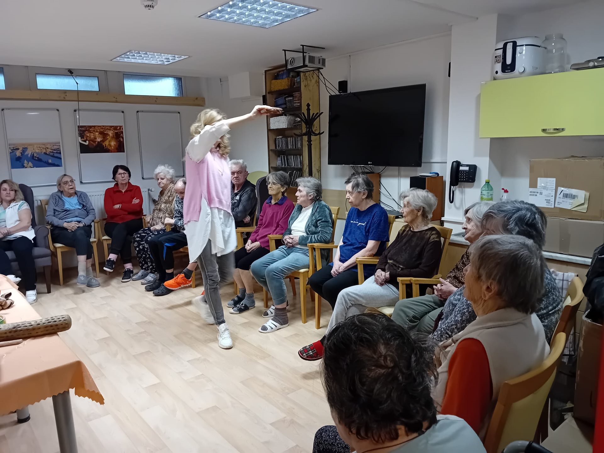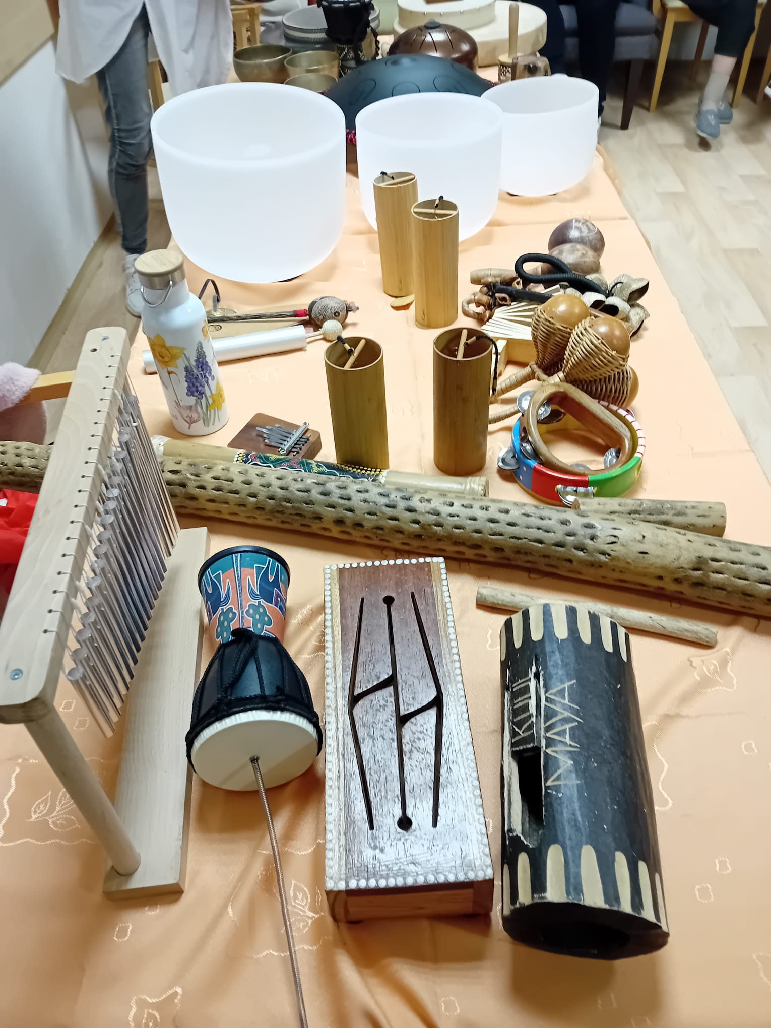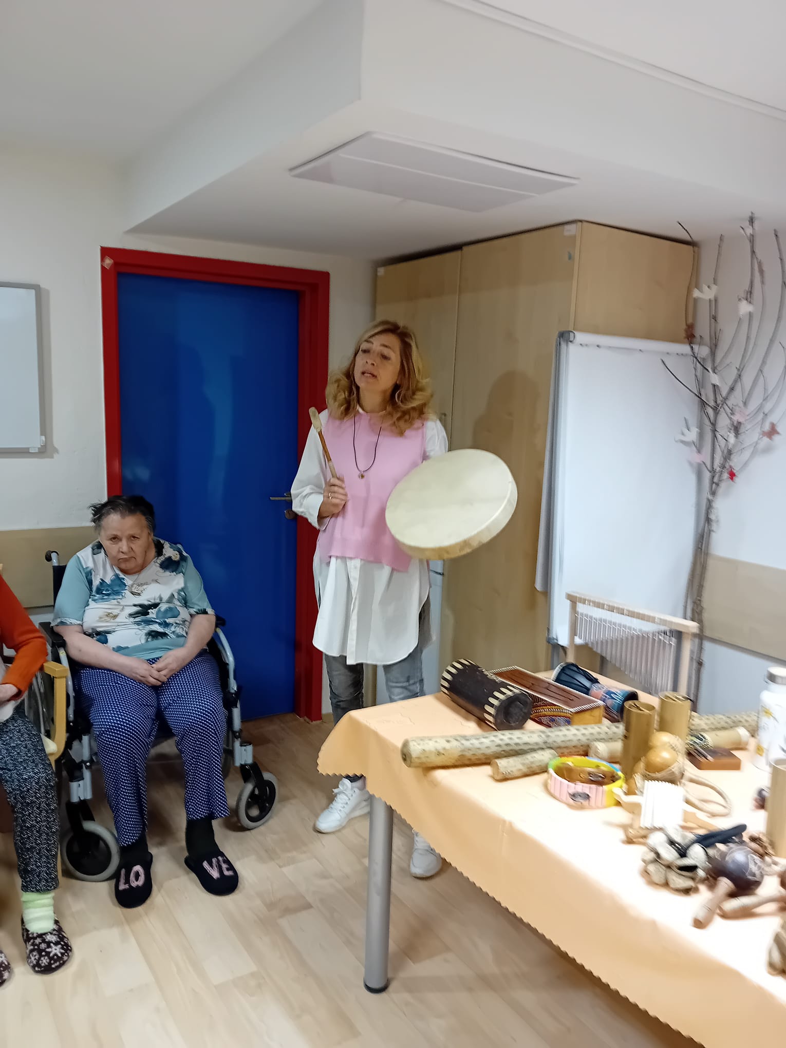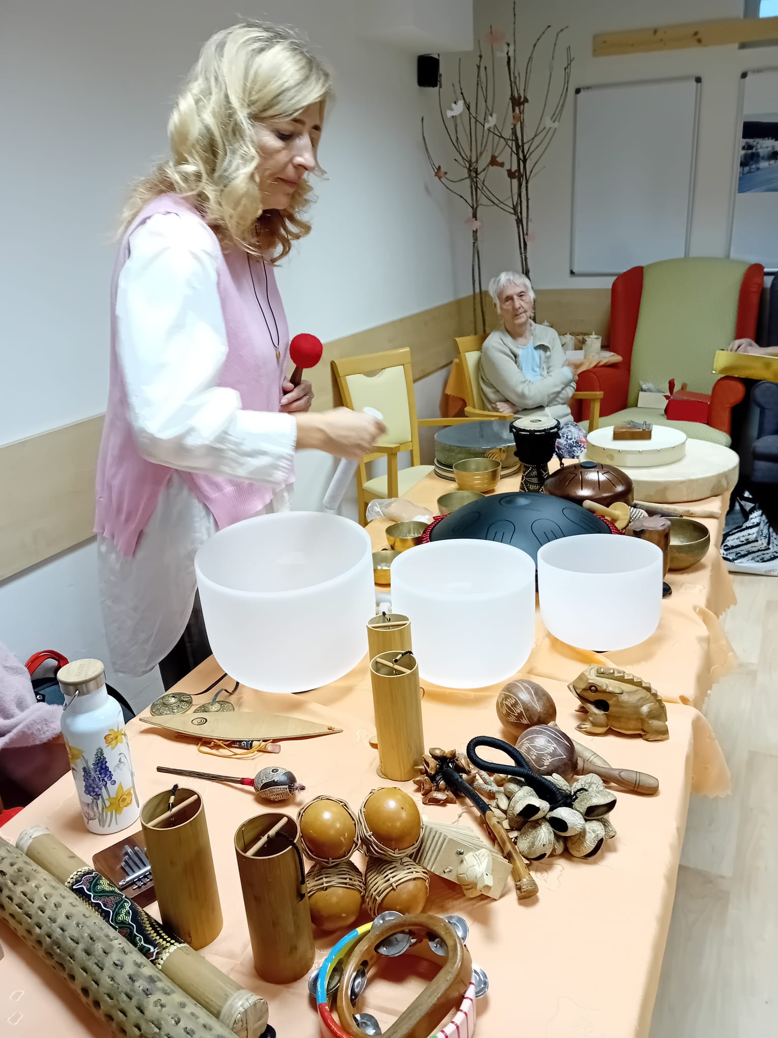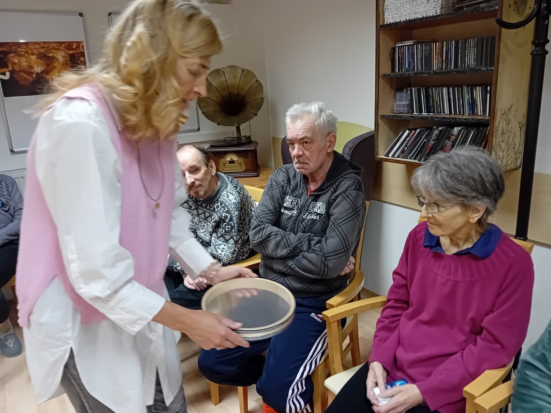 V pátek 15. 11. 2024 měli naši klienti možnost zažít setkání s léčivou hudbou prostřednictvím hudebních nástrojů z celého světa, které jsou převážně vyrobeny z přírodních materiálů. Tento zážitek nám umožnila paní Klára Veselá, která klienty postupně seznamovala s těmito nástroji, jejich působení na tělo a jeho duši. Zaposlouchali jsme se do zvuků tibetských mís, chřestidel, handpanu, šamanského bubnu, perkuse, deštné hole, kalimby, zvonkohry, ocean drum…..Tyto nástroje nás přenesly např. k moři, do deštných pralesů a k indiánům. Moc děkujeme za krásné dopoledne.