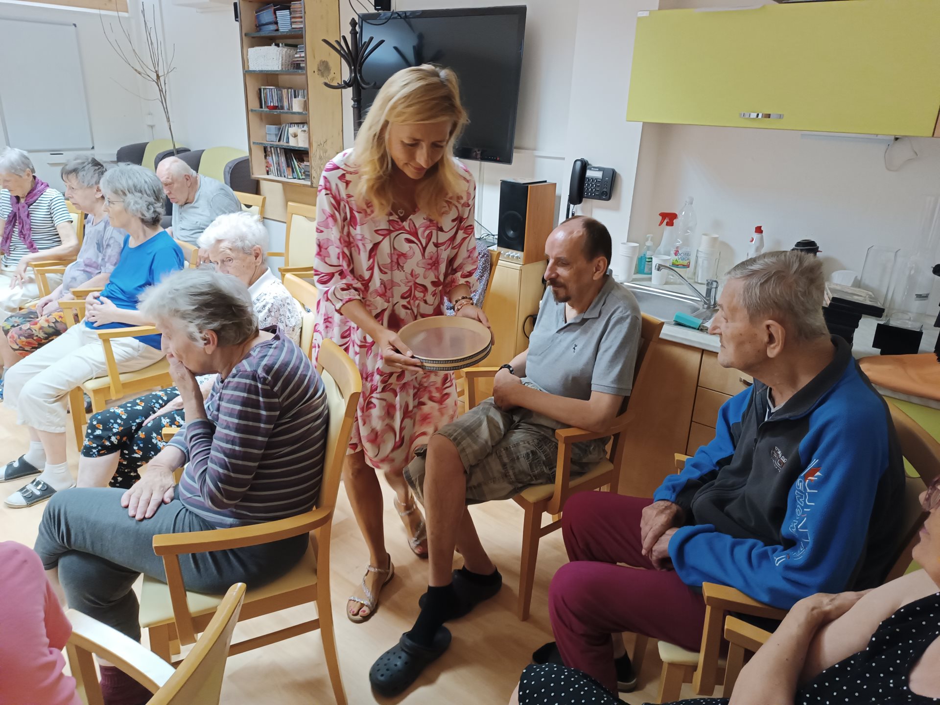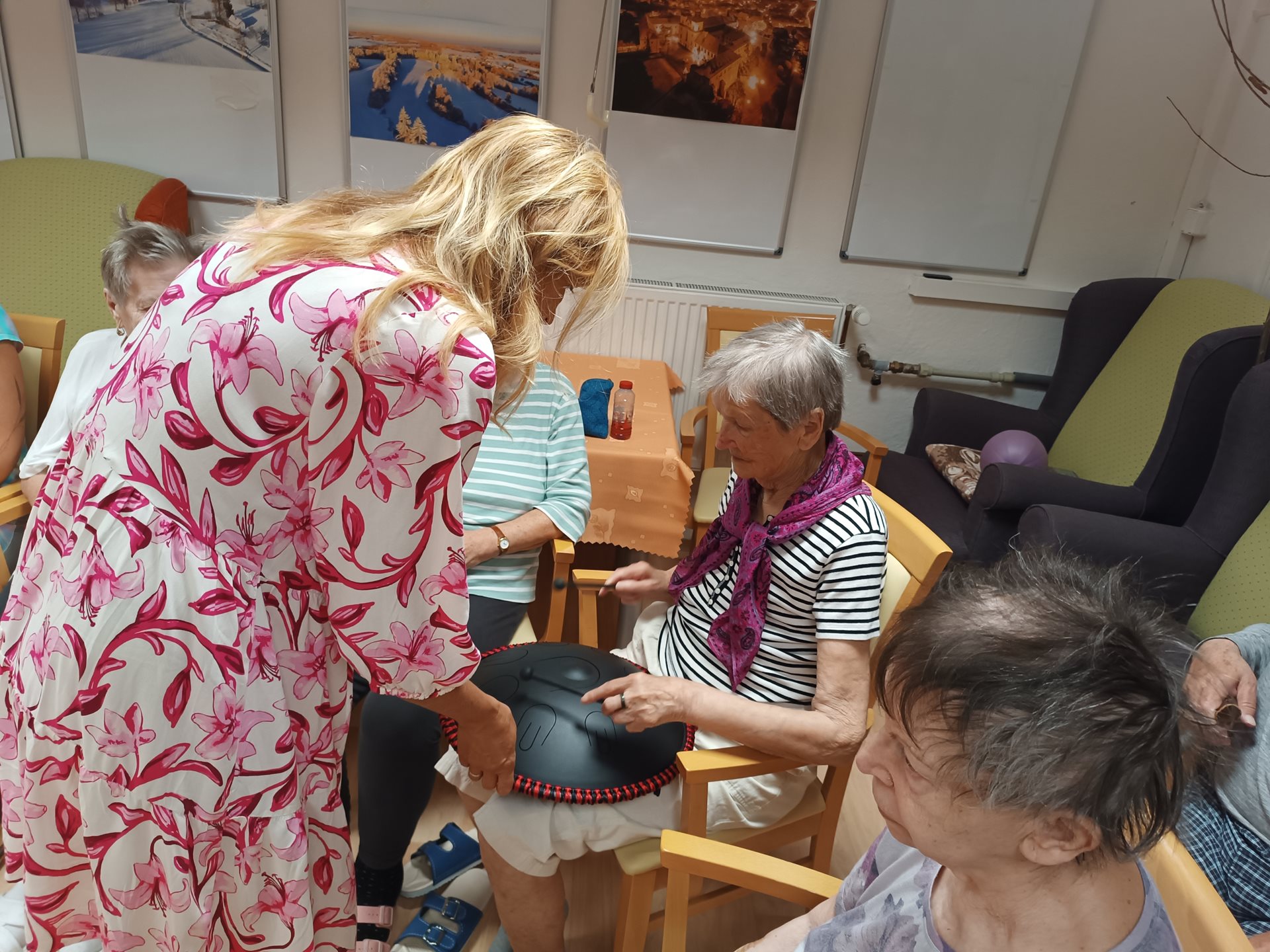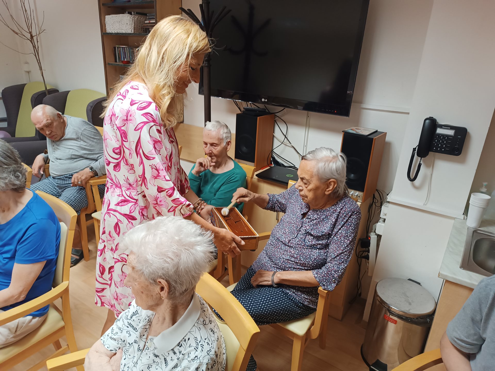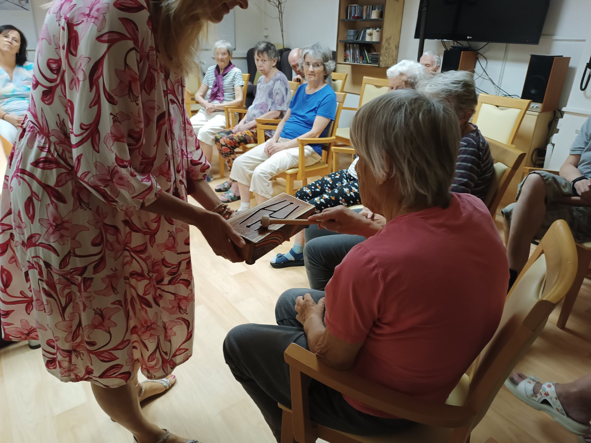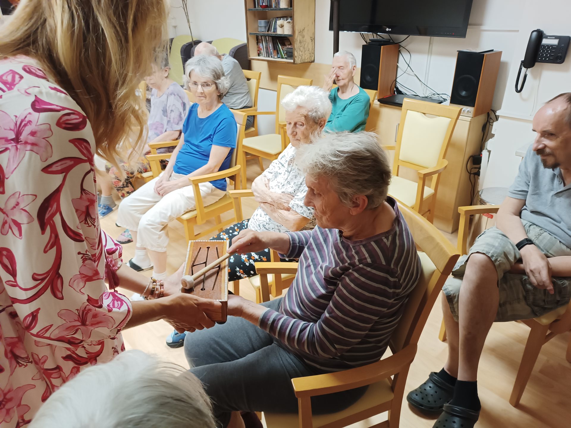 Dnešní dopoledne nám obohatila paní Klára Veselá, která klientům představila léčivé hudební nástroje s různých koutů světa. Klienti měli možnost si na ně zahrát a zároveň se dozvěděli zajímavosti o těchto nástrojích. Na další návštěvu se těšíme už v listopadu, kdy se léčivé zvuky rozezní i na pokojích klientů, kteří neměli tu možnost za námi přijít.