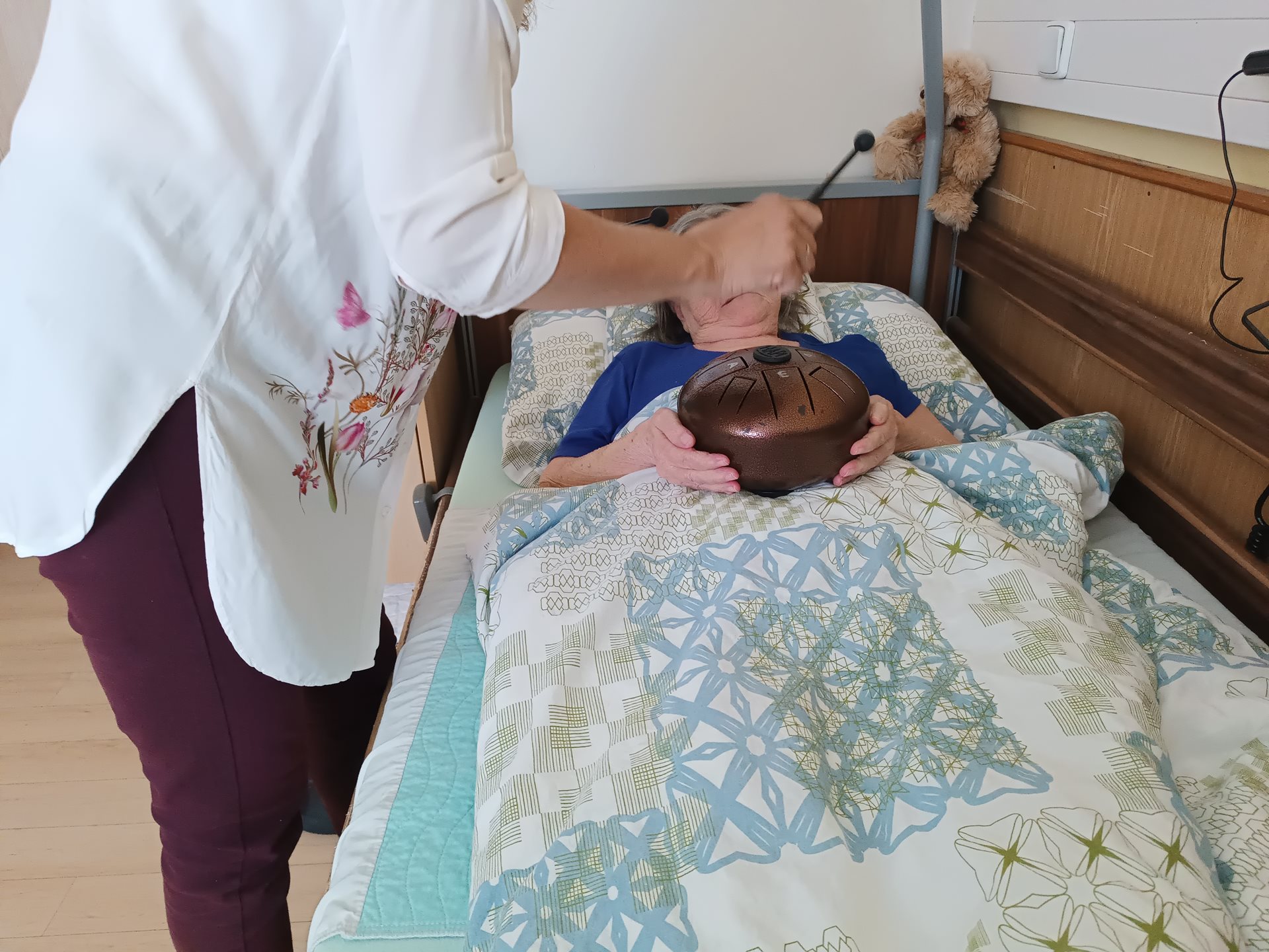 Už po několikáté nás navštívila u lůžek našich klientů s léčivými nástroji paní Klára Veselá. Klienti se zaposlouchali do tónů a uvítali možnost si nástroje vyzkoušet. Děkujeme za tuto příjemnou návštěvu a těšíme se na další setkání.