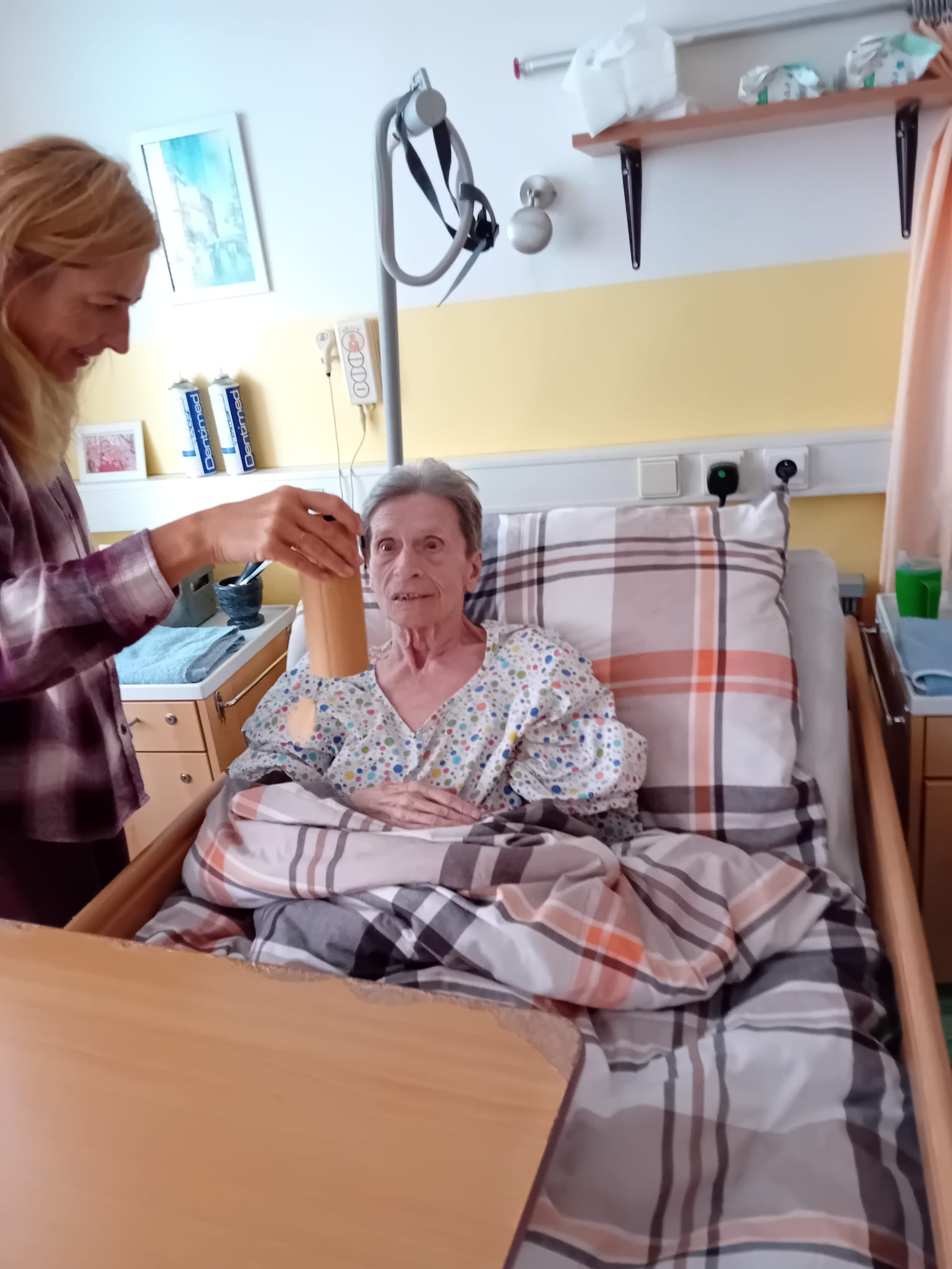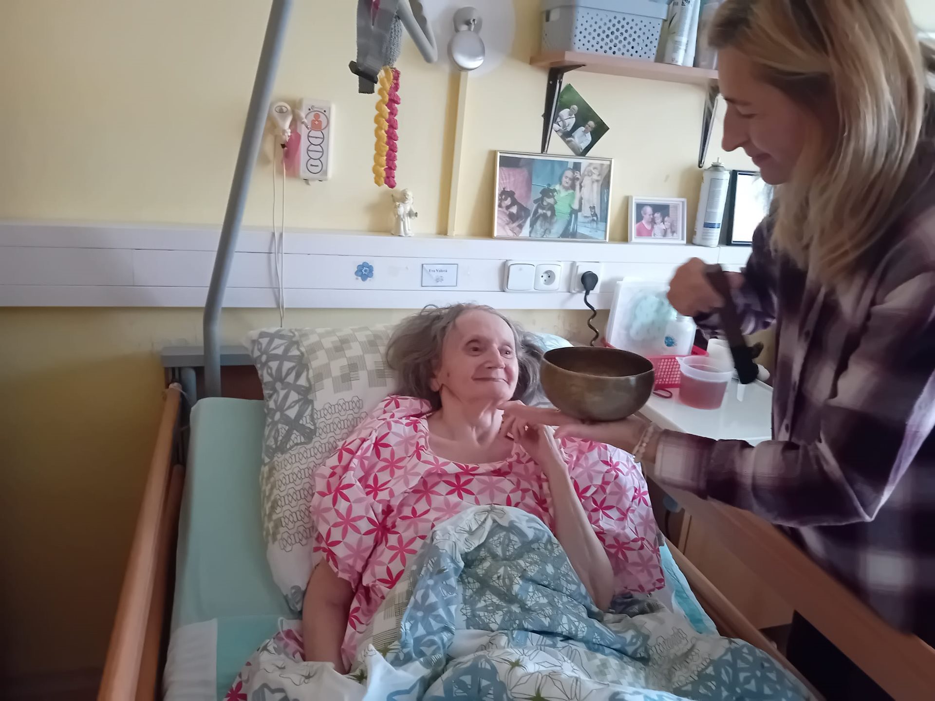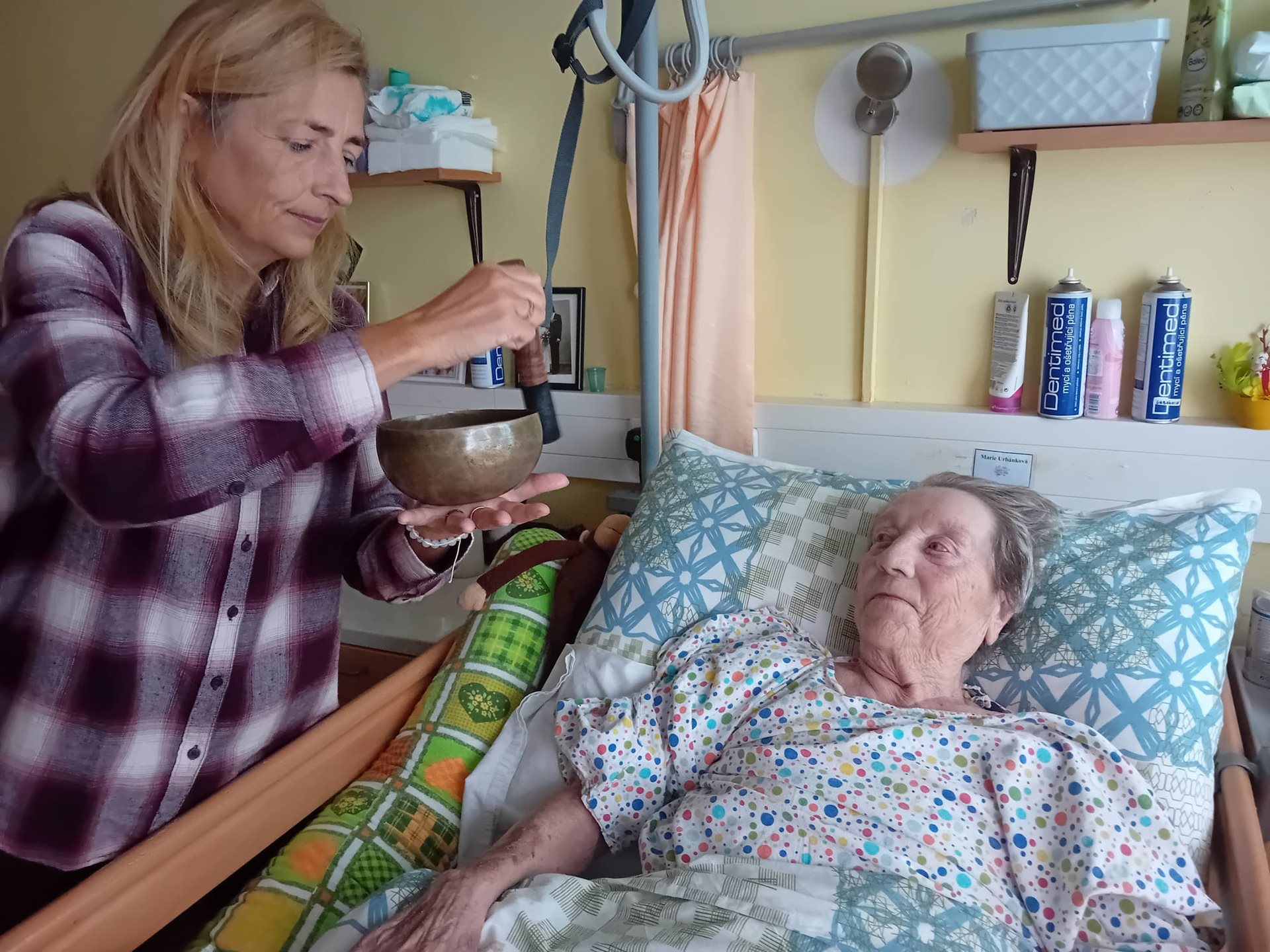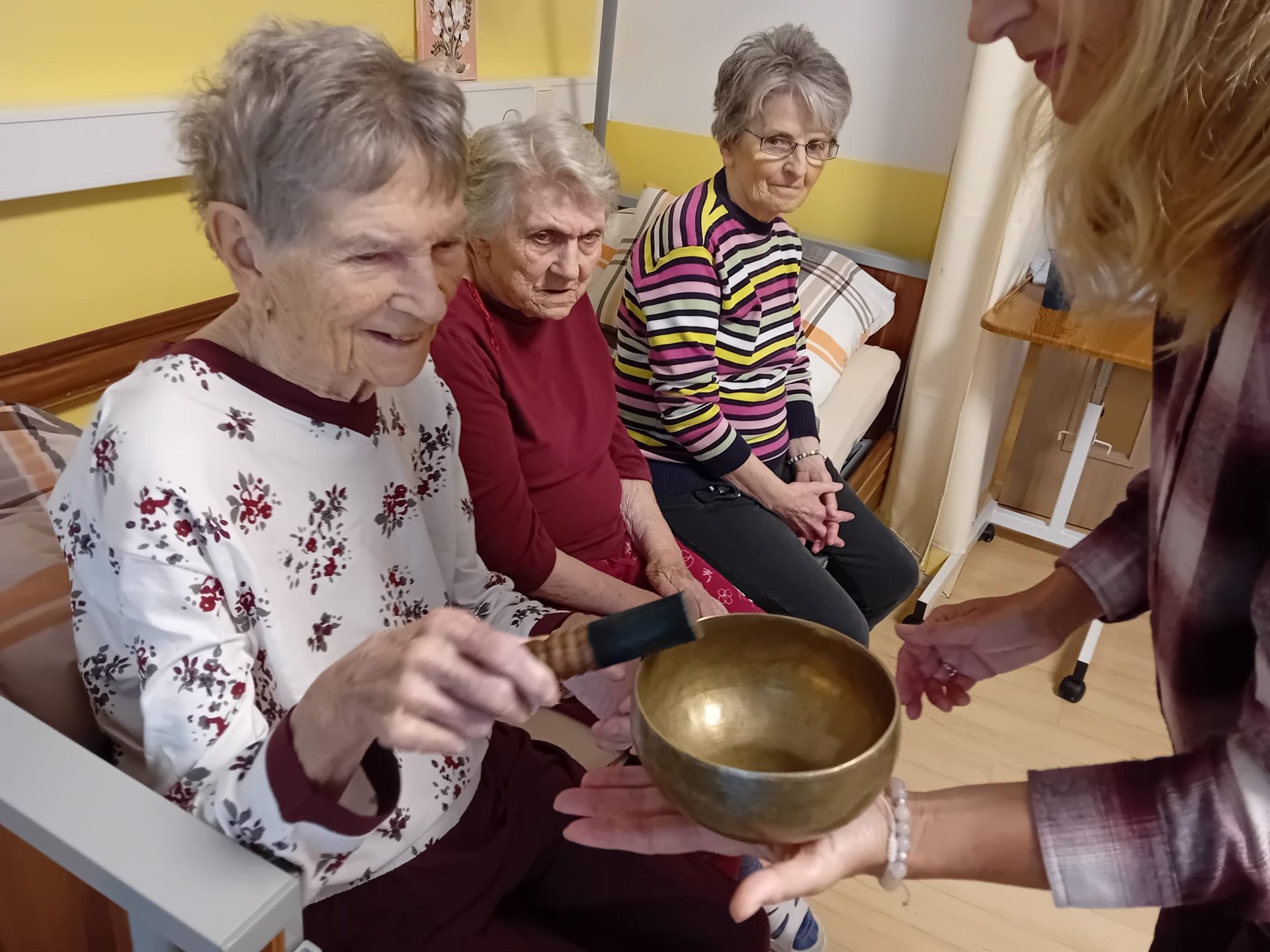 Dne 11.11.2025 naše klienty navštívila již po několikáté paní Klára Veselá se svými léčebnými nástroji. Setkání proběhla na pokojích u lůžek klientů. Paní Klára Veselá postupovala velmi citlivě a individuálně. Ke každému klientovi přistupovala s úctou a respektem k jeho aktuálnímu stavu a potřebám. Využívala jemné tóny tibetských mís, deštného sloupu, vodního bubínku a dalších nástrojů. Uklidňující vibrace se šířily prostorem a zklidňovaly mysl klientů, kteří na ně reagovali různě. Někdo začal hluboce dýchat, zavírat oči, usmívat se a bylo vidět uvolnění v obličeji. Někteří popisovali i pocity tepla. Citace jedné klientky „Cítím takový klid“. Pro některé klienty, kteří trpí demencí nebo jsou méně verbální, byly neverbální signály- např. uvolněné dýchán- jasným důkazem tohoto působení. Tato návštěva nám znovu připomněla, jak v péči o seniory nezapomínat na celostní přístup. Moc děkujeme paní Kláře Veselé za její návštěvu. Věříme, že tyto okamžiky harmonie a uvolnění se pozitivně propsaly do prožitků našich klientů, které jim přinesly pocit klidu a pohody. Budeme se i nadále snažit tyto aktivity opakovat a jejich život obohatit.
