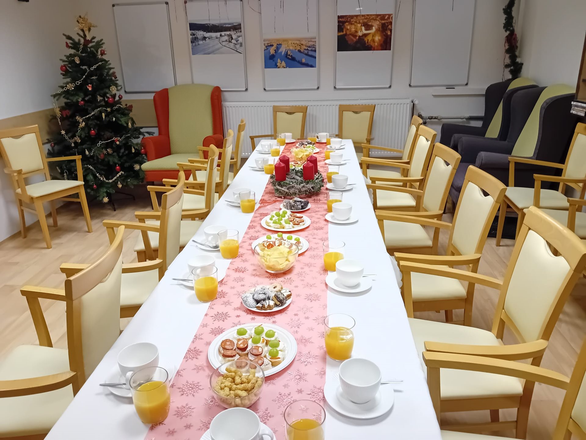 S našimi klienty jsme přivítali blížící se nový rok. Silvestrovská oslava byla plná laskavých slov, smíchu, zpěvu a dobrého jídla. Na přání klientů se zařadily do programu známé scénky s Vladimírem Menšíkem, Jiřinou Bohdalovou, Felixem Holzmannem a dalšími mistry zábavy. Společným přípitkem jsme vyjádřili vděčnost za prožitý rok 2025 a popřáli si, abychom se za rok opět všichni ve zdraví sešli. Závěrem bychom rádi poděkovali společnosti RENOMIA, která našim klientům věnovala sladké pohoštění. Velmi si toho vážíme a děkujeme za podporu, která přispěla k radostné atmosféře celé oslavy.